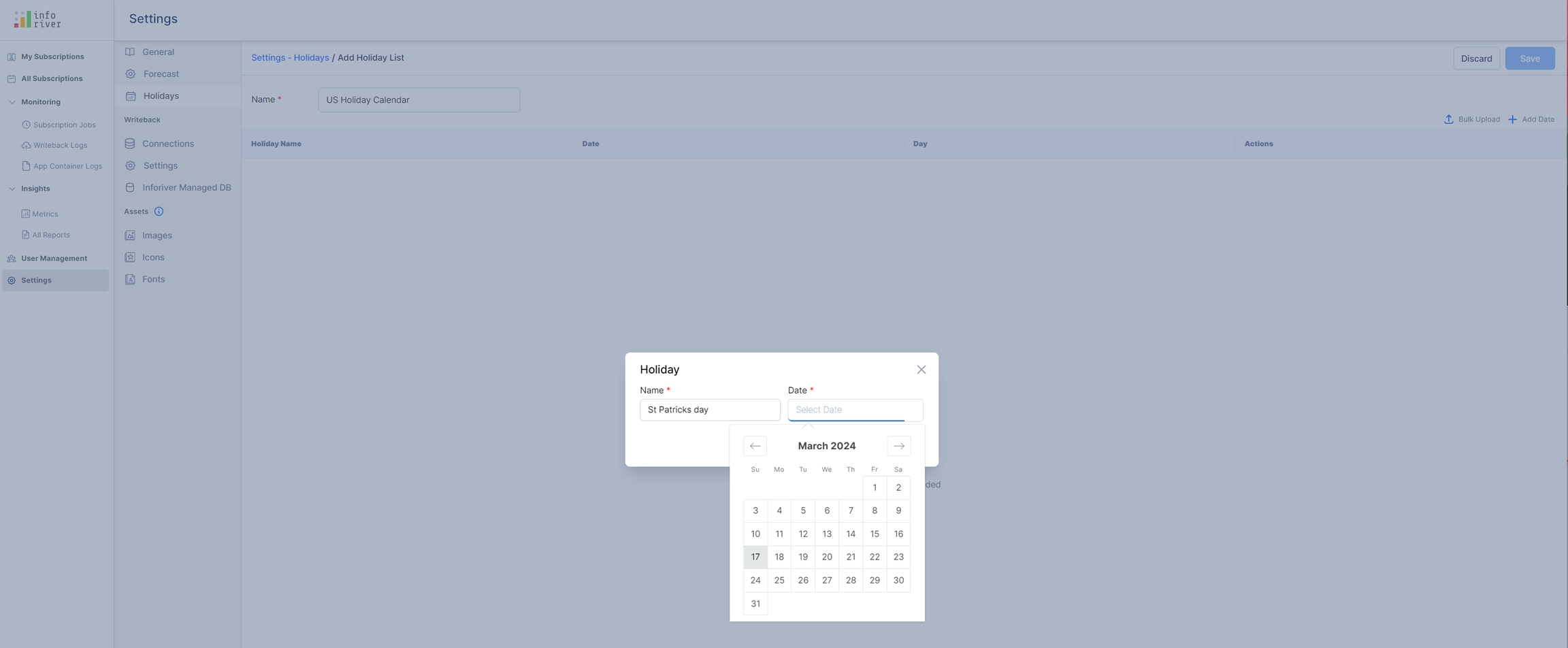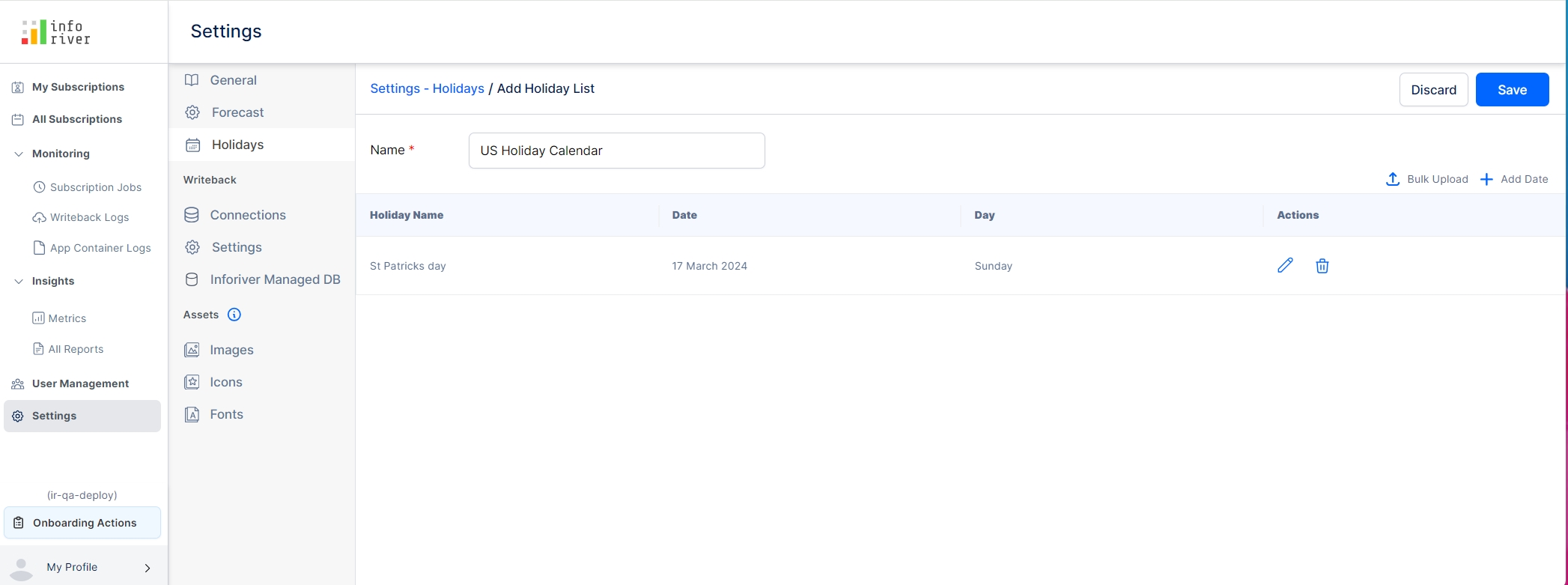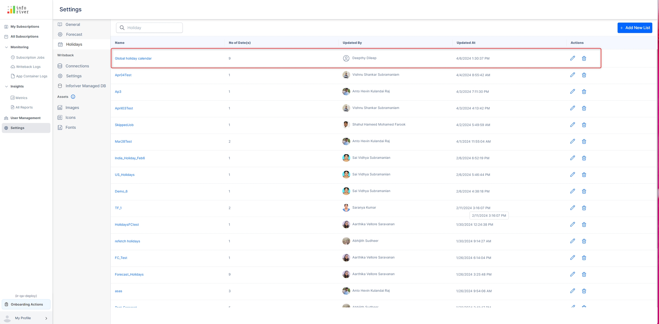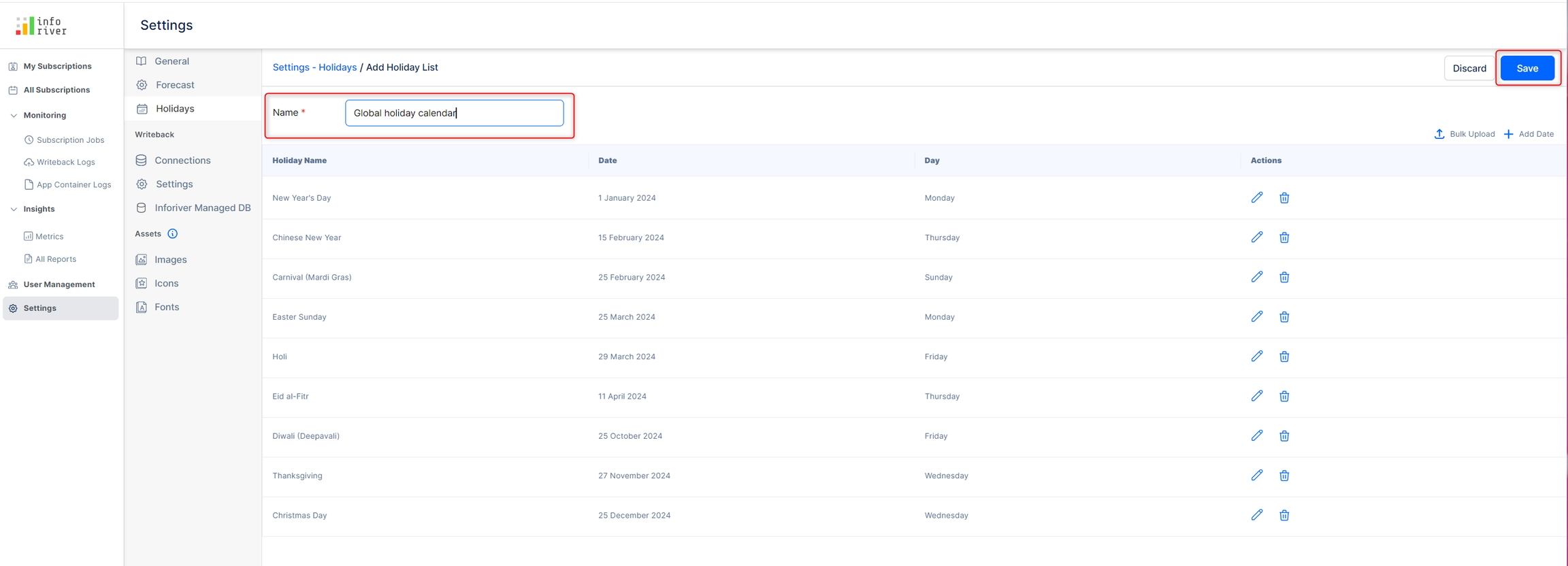 Inforiver admins have the ability to create a custom holiday calendar. The calendar can be used to ensure that subscription jobs are kept on hold during holidays and forecasts are not automatically closed on holidays. In the Inforiver console, navigate to Settings > Holidays to view the list of holiday calendars.