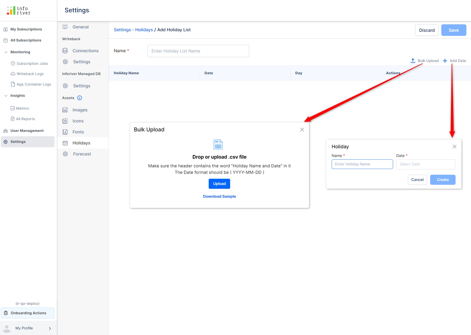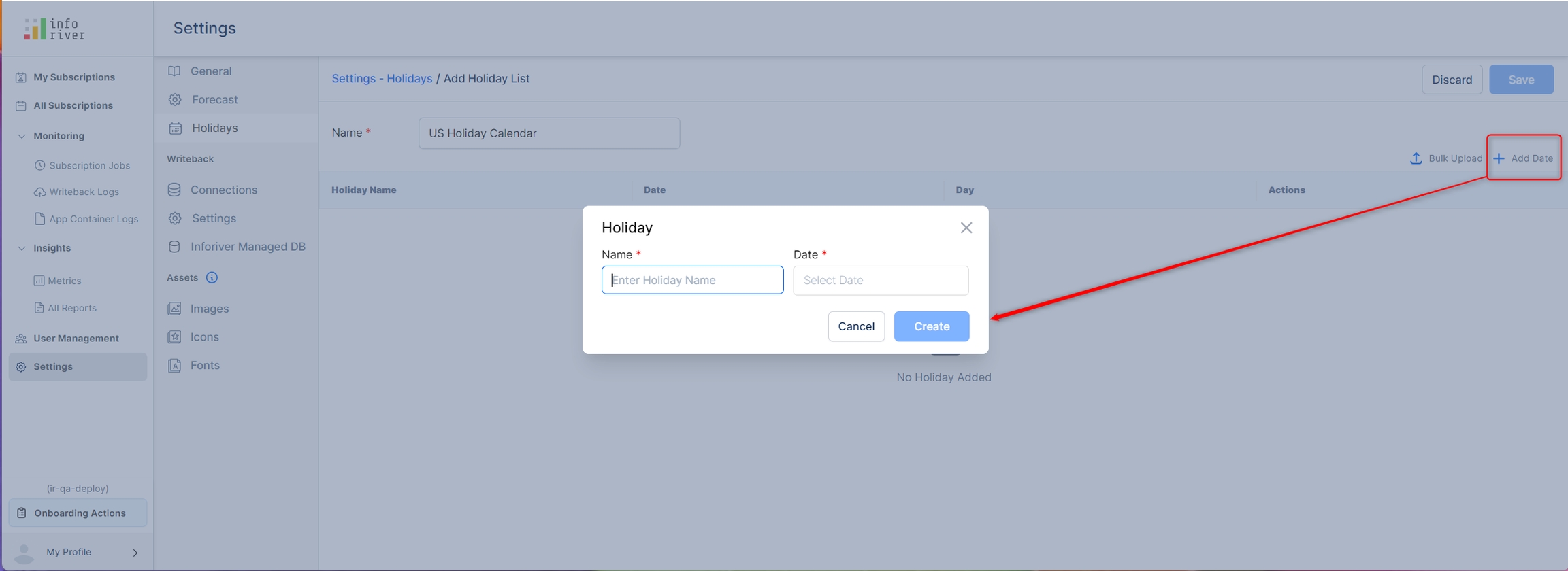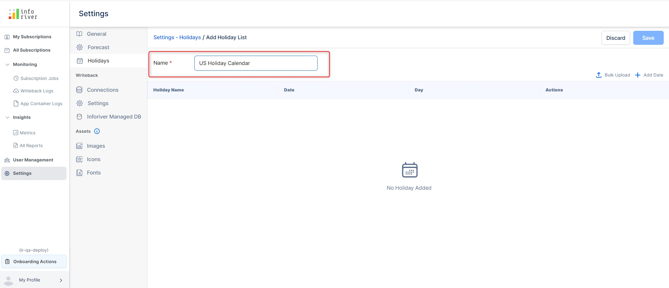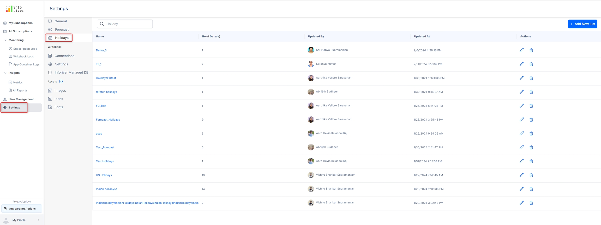 Inforiver admins have the ability to create a custom holiday calendar. The calendar can be used to ensure that subscription jobs are kept on hold during holidays and forecasts are not automatically closed on holidays. In the Inforiver console, navigate to Settings > Holidays to view the list of holiday calendars.