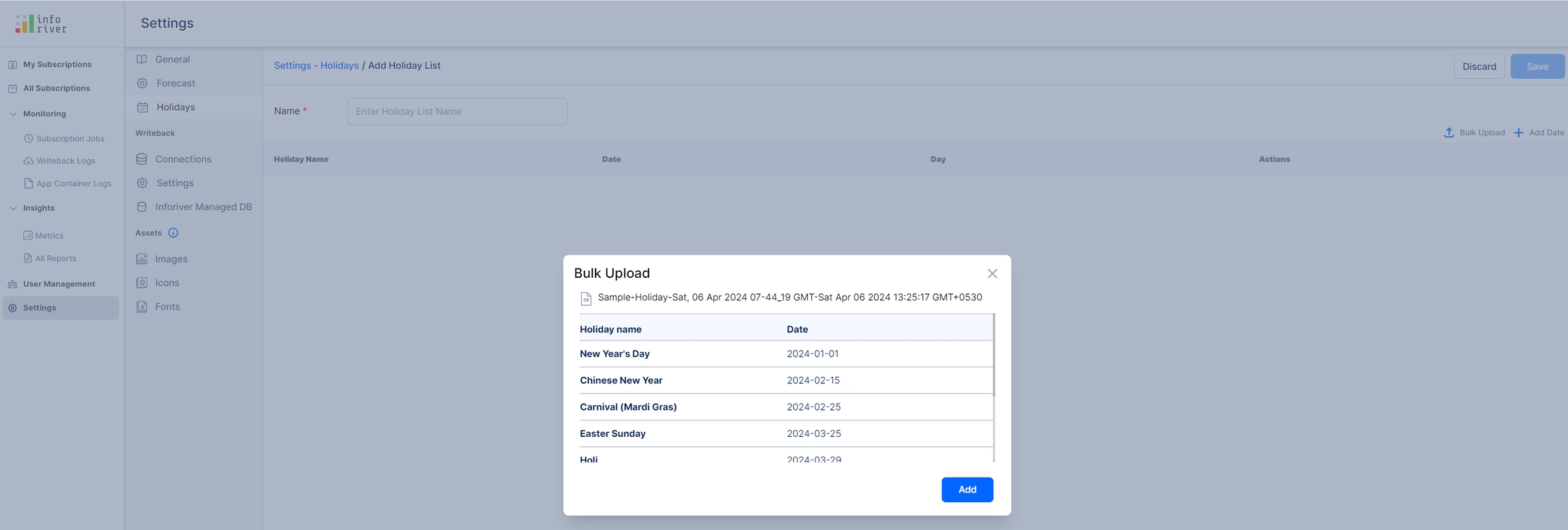Step 3: Click the upload button and choose the file. Inforiver creates a preview of the holiday calendar that is being uploaded. Click the Add button.