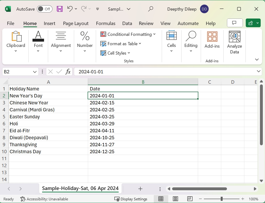 Step 2: Open the Excel file. Enter the holiday names and the date in YYYY-MM-DD format.