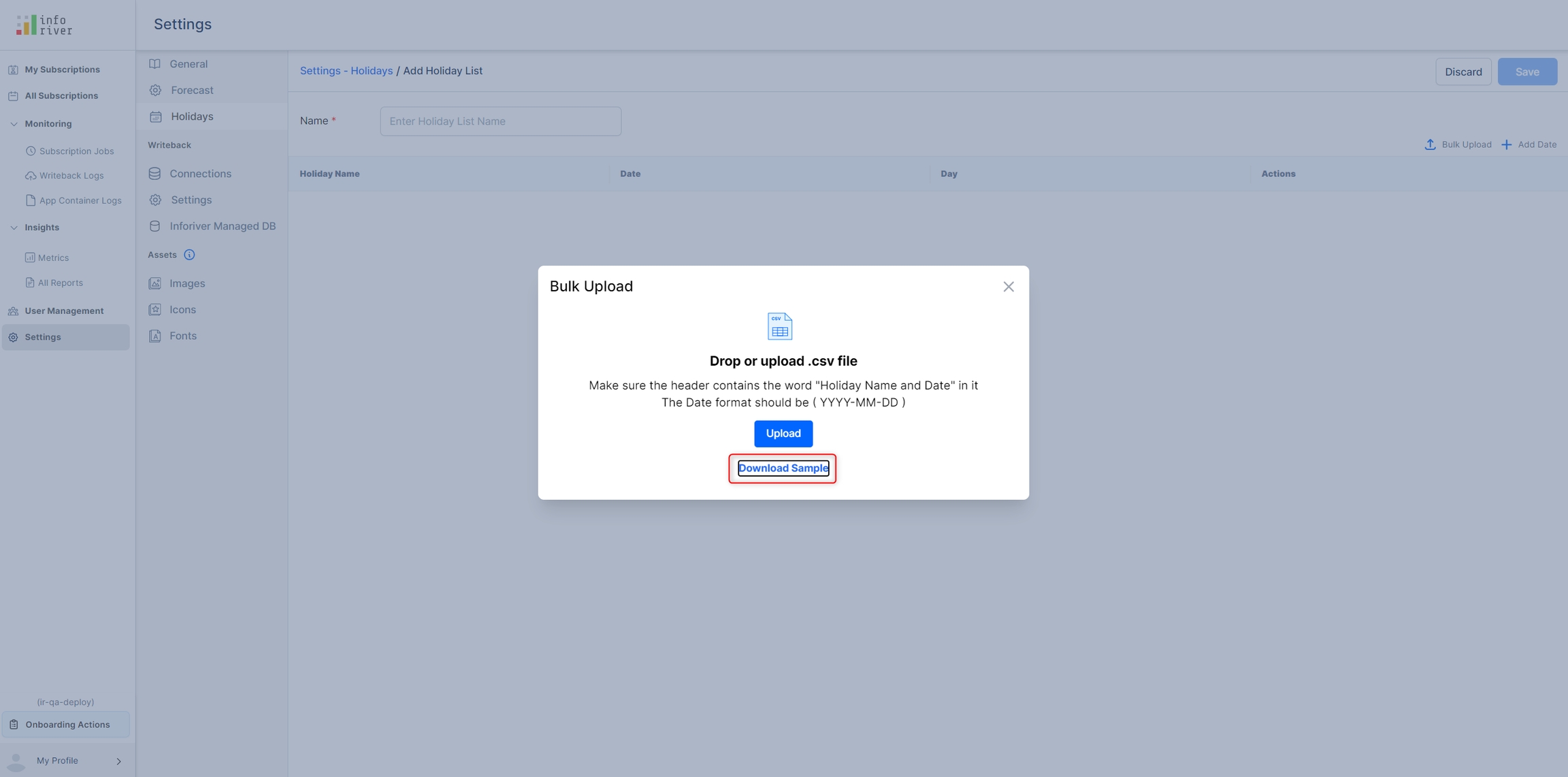 Step 1: Click the download sample link. Inforiver provides a template Excel spreadsheet that you can use to fill in the list of holidays.