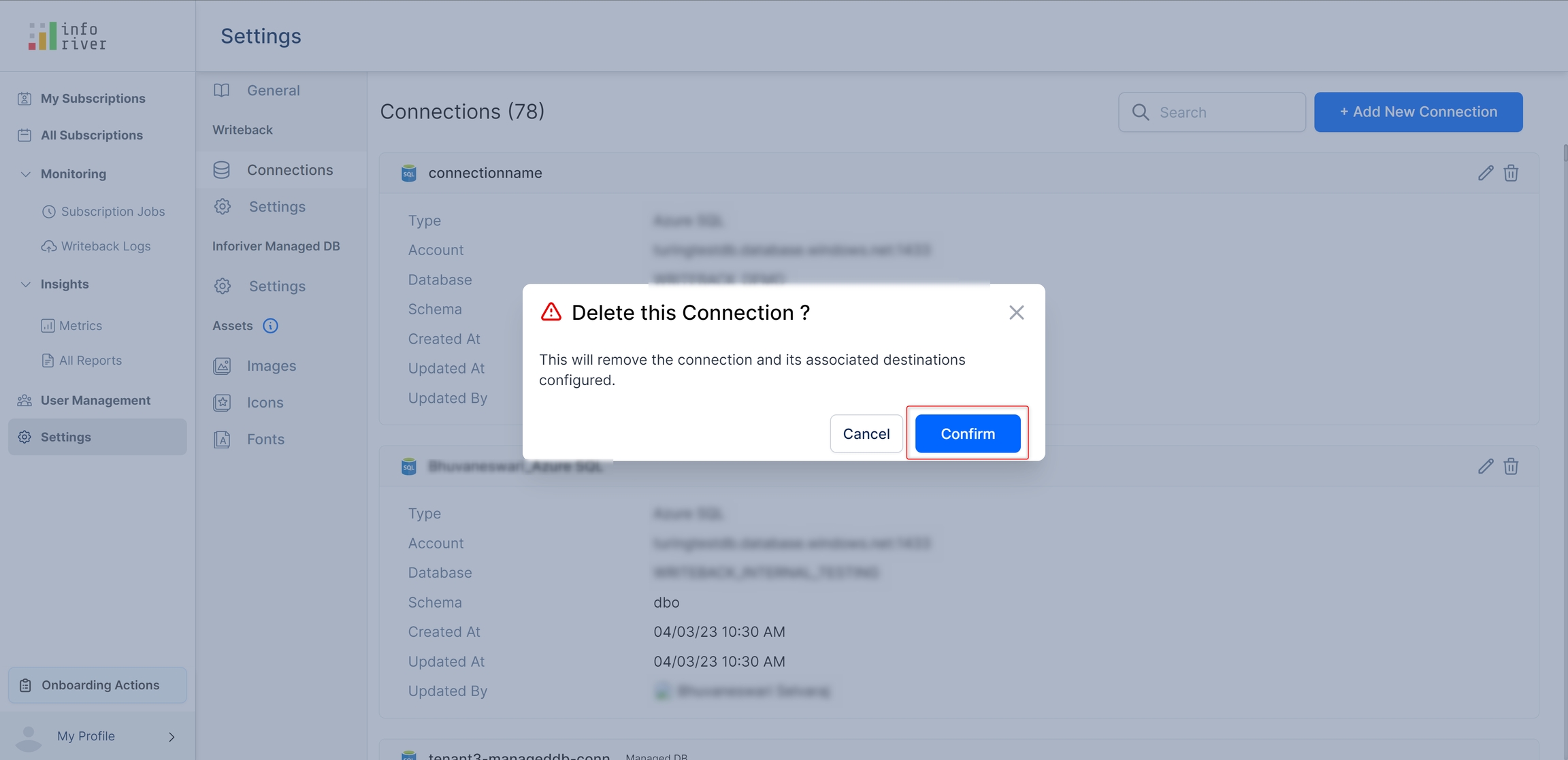 This will open up a 'Confirmation' modal. Click 'Confirm' to permanently delete the connection.