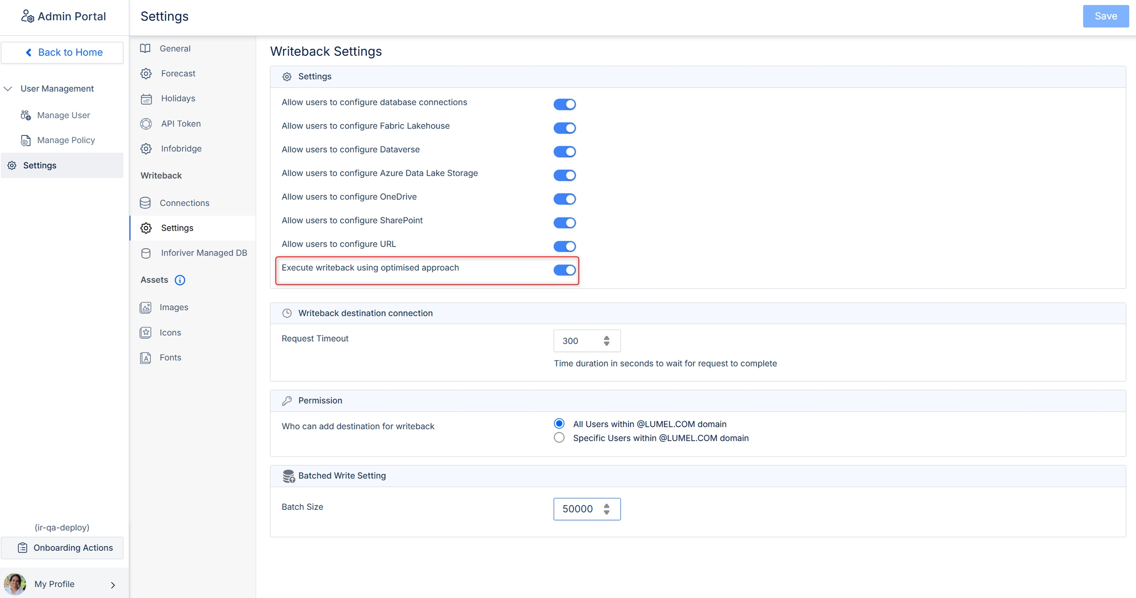 To trigger faster writebacks, enable the Execute Writeback using optimized approach toggle from the Admin console > Writeback Settings. This option is enabled by default for both existing tenants and new tenants. This option can be disabled at any point.