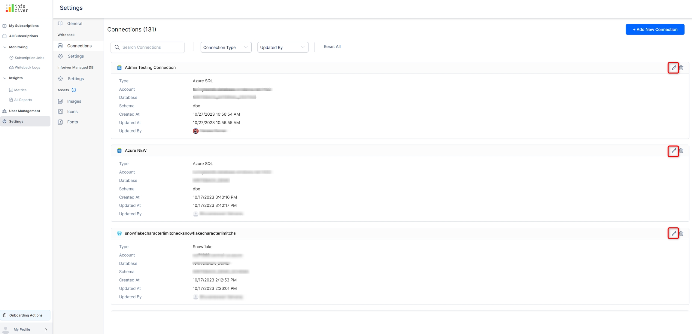 You can edit the available connections using the edit icon(pencil) available on the top right corner of each connection.