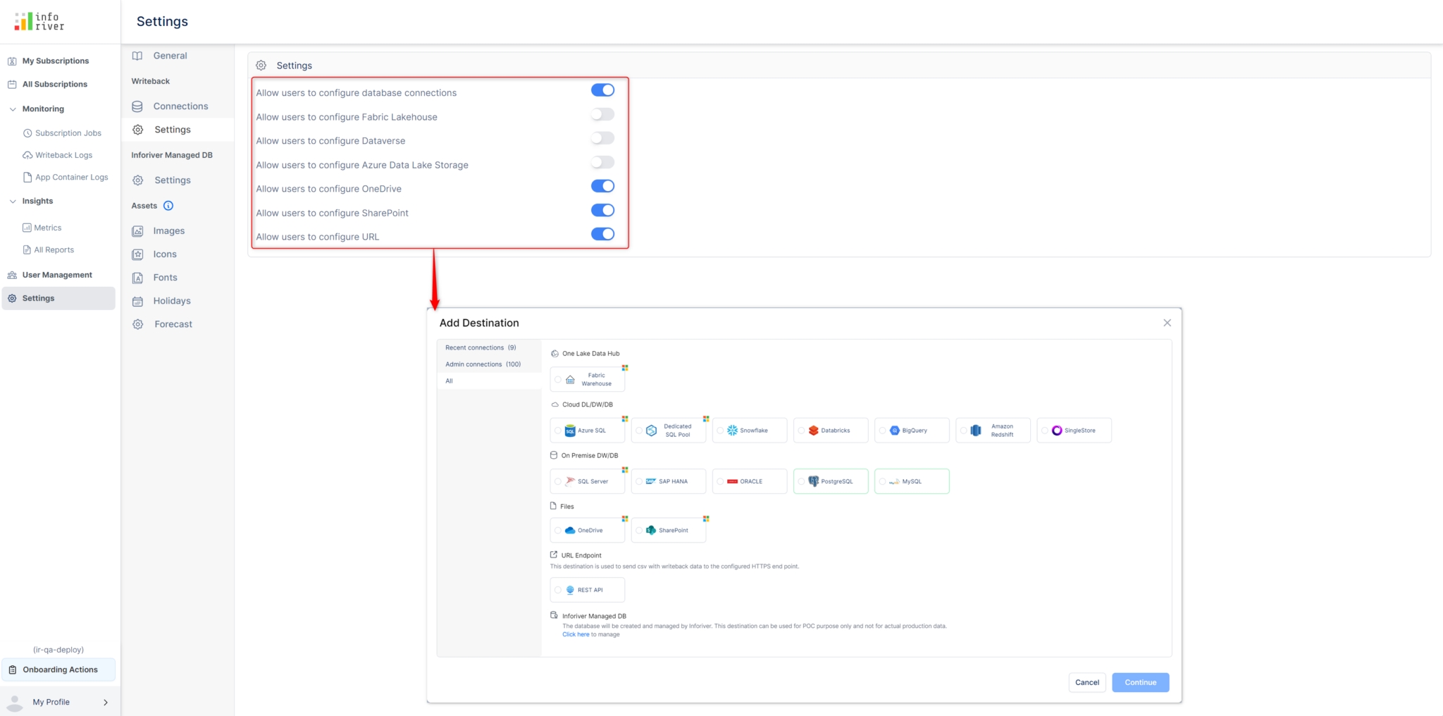 Users will be able to add destinations based on the settings configured by the admin. Admins can restrict users from creating destinations altogether or restrict the creation of certain types of destinations. For example, the admin can prevent users from creating database destinations by disabling the Allow users to configure database connections option. When the toggle button for a particular destination type is disabled, users will only be able to use admin-configured destinations and cannot create their own.