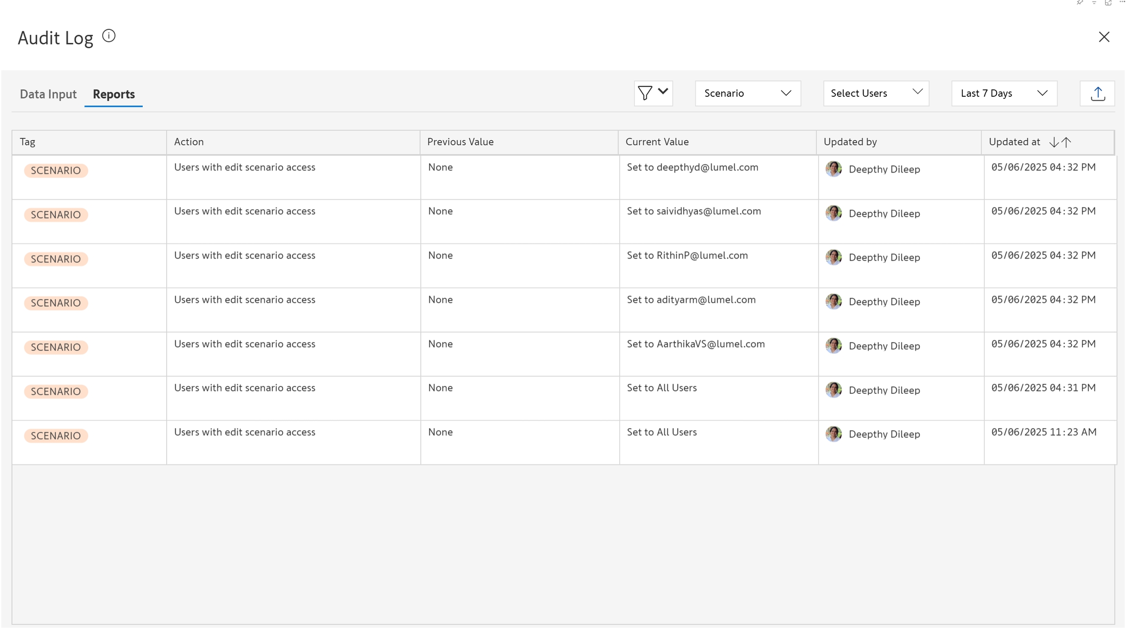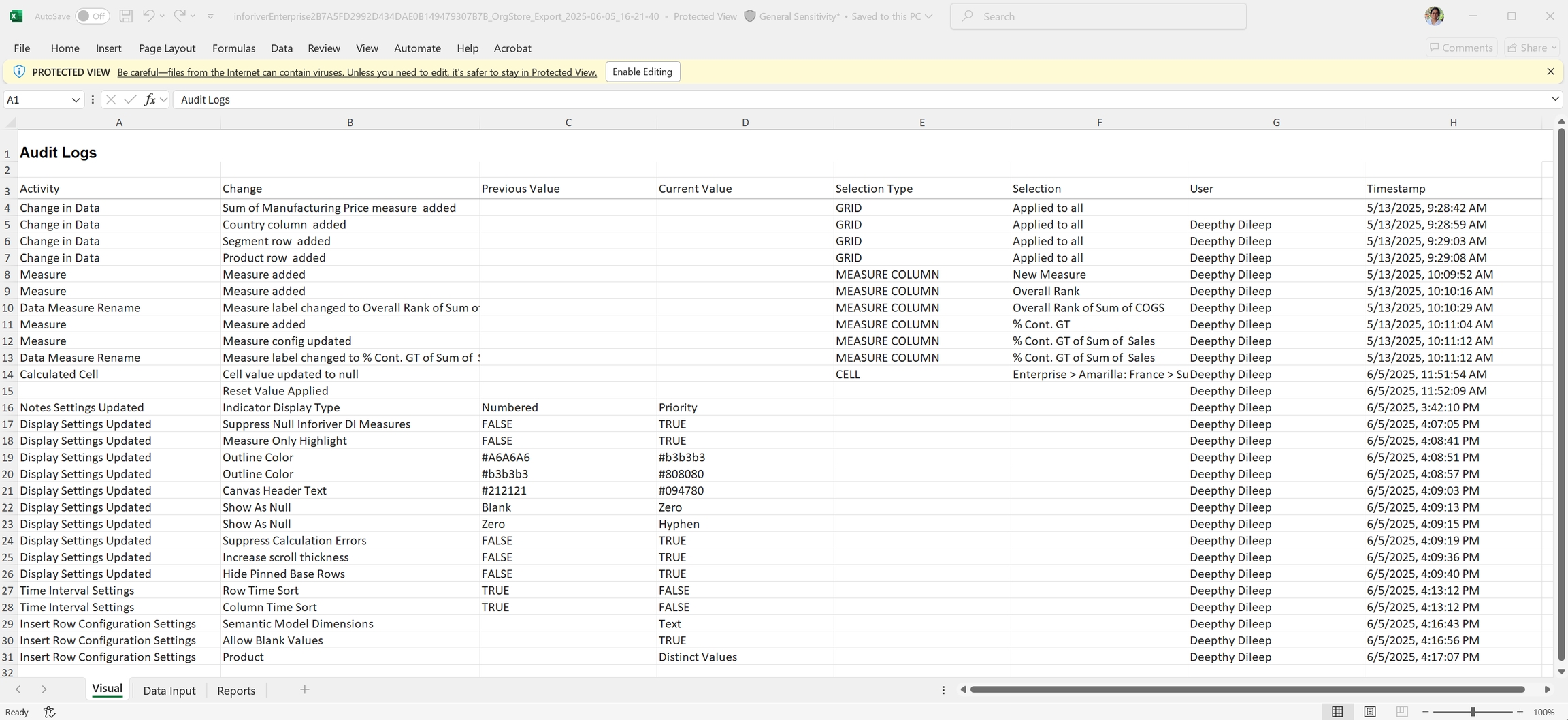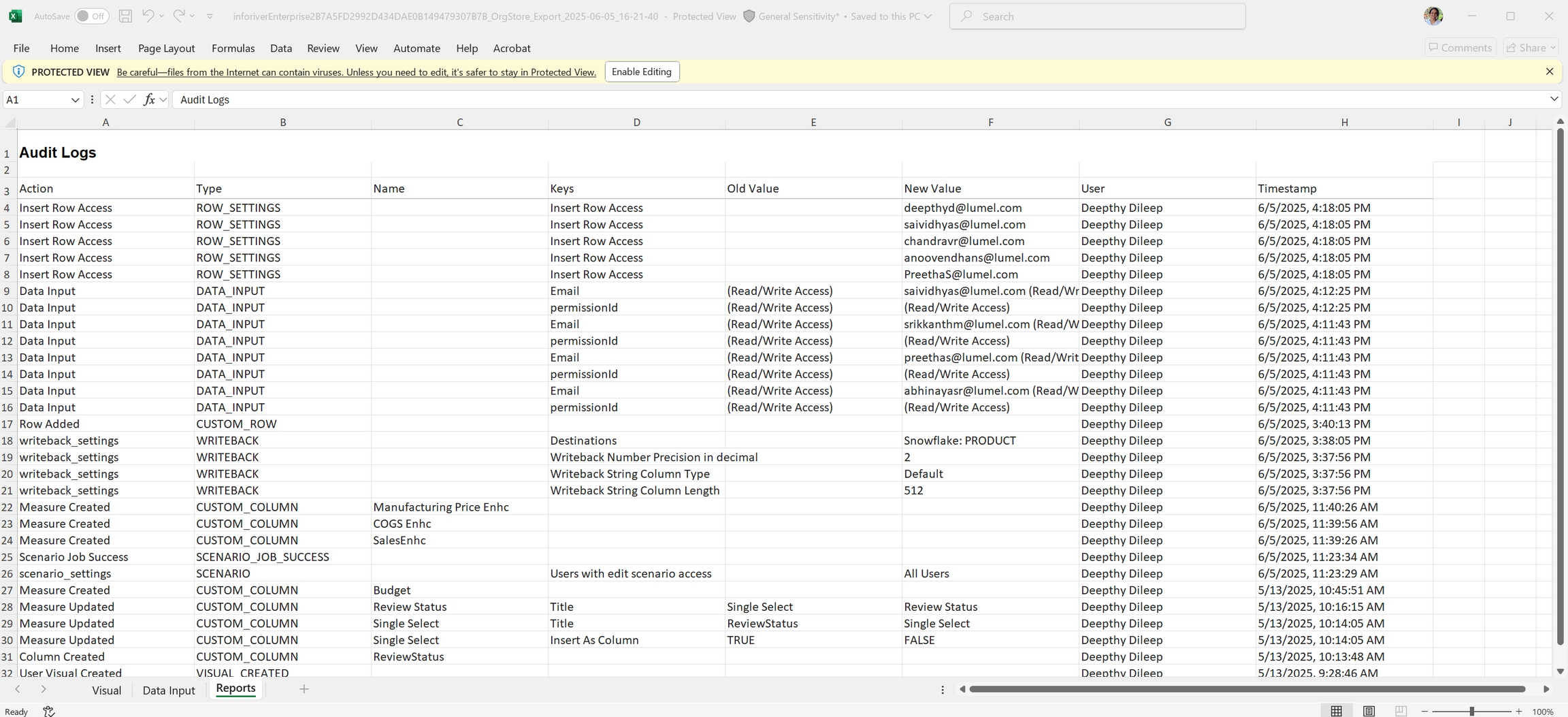 Reports: Captures changes such as the creation of measures or scenarios within Inforiver. It also captures changes to read/write access settings.