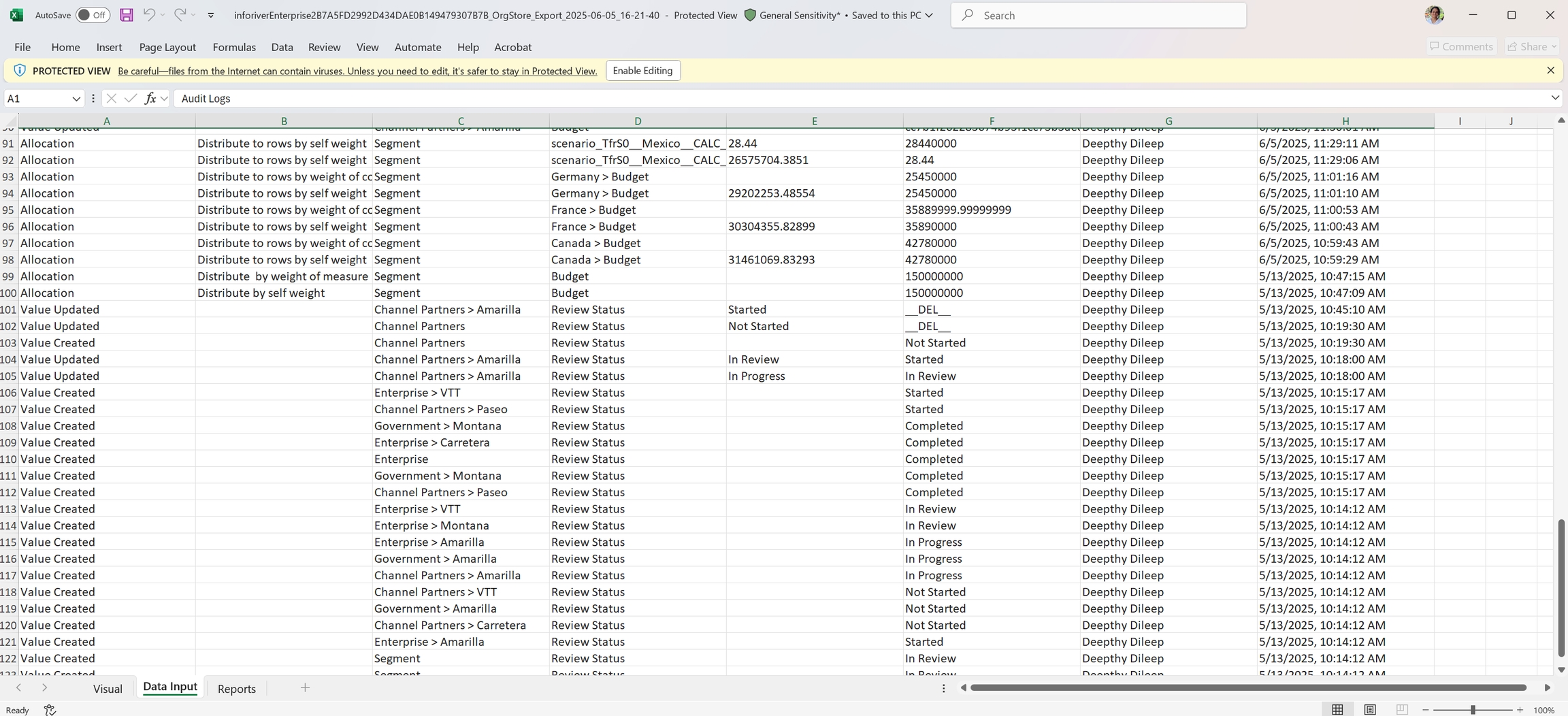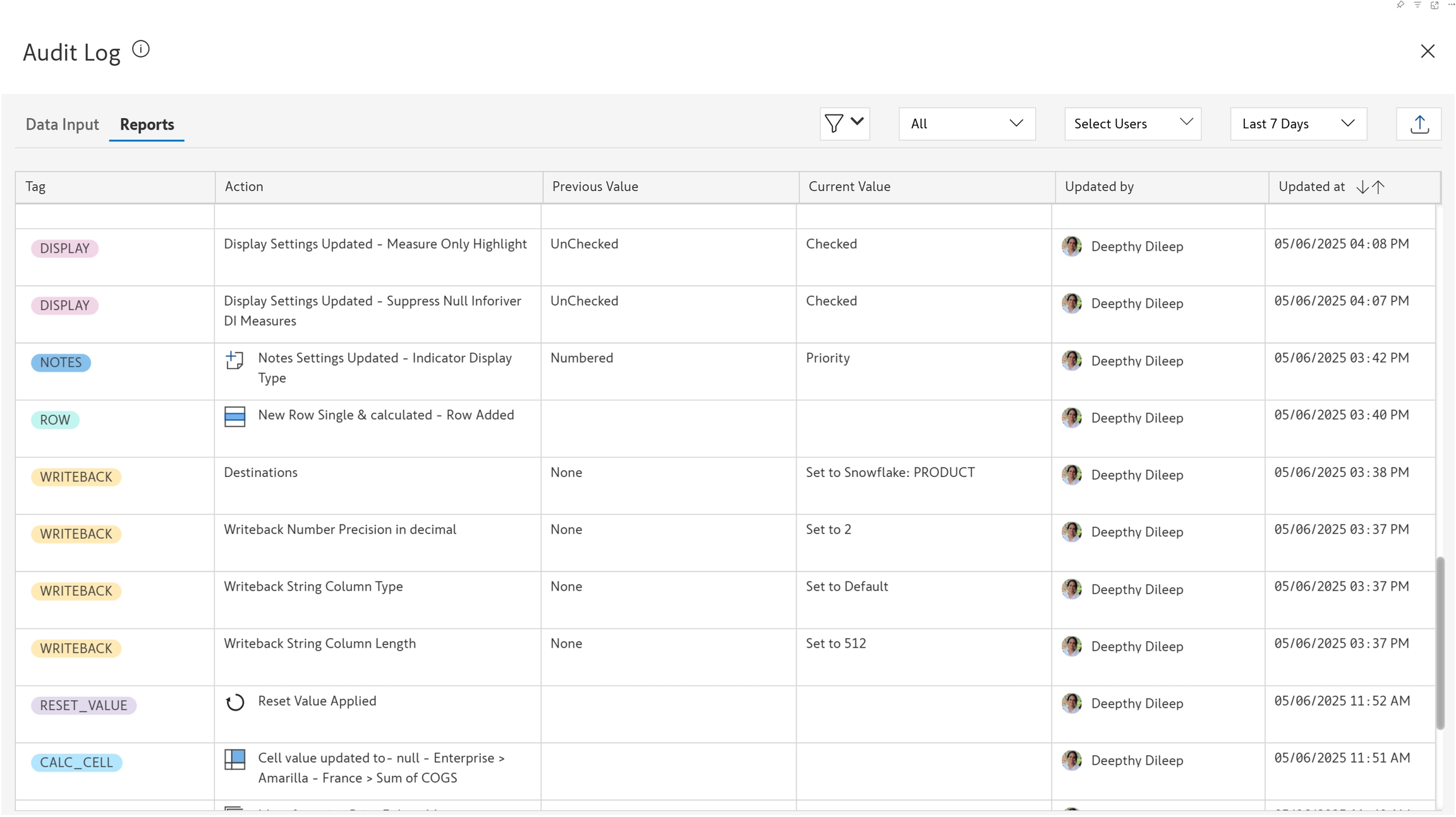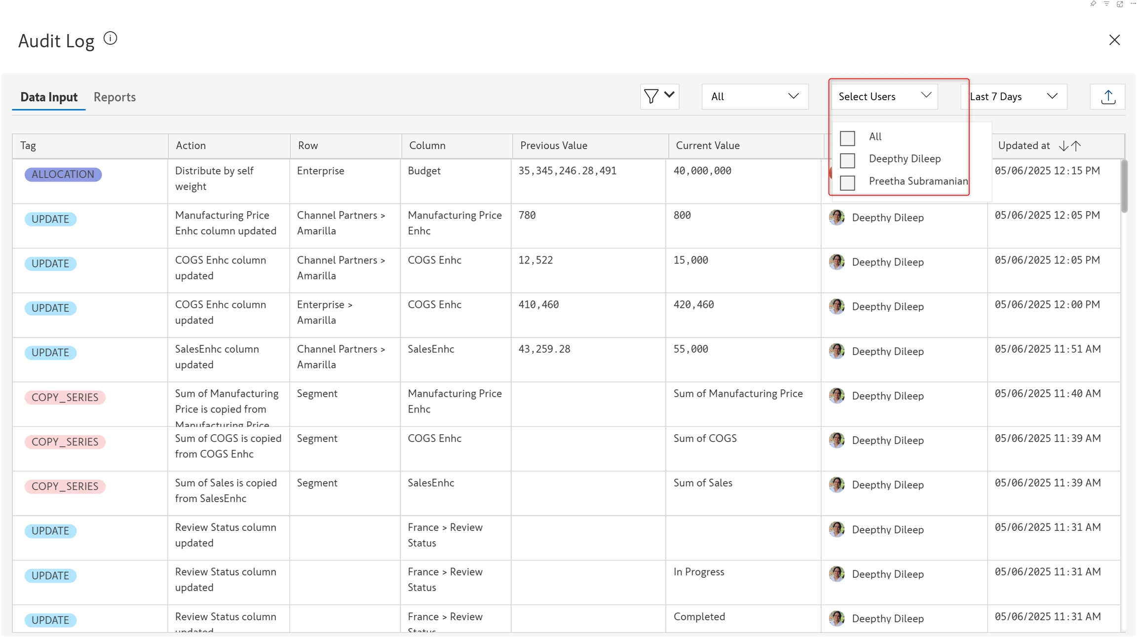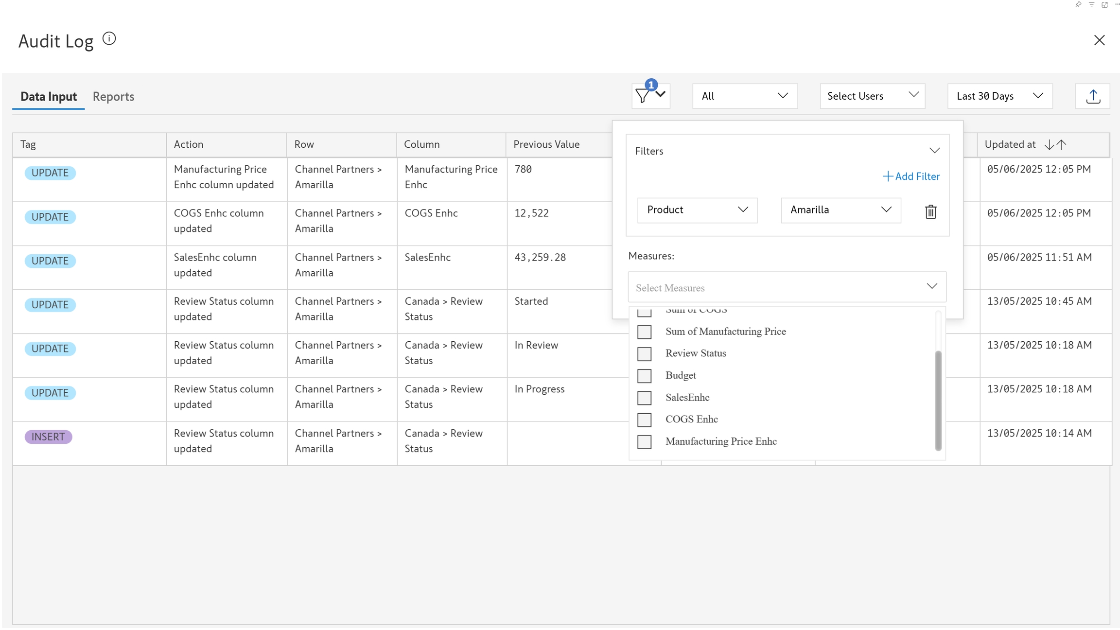 In the Insert tab, click on the Audit option. The audit log is a full-page, spreadsheet-style window - complete with filters and dropdowns - making it easier to track and manage audits. The Data Input tab, as the name implies, captures all the changes made to data input fields. The Reports tab captures the dimensions and measures added to or modified in the report.