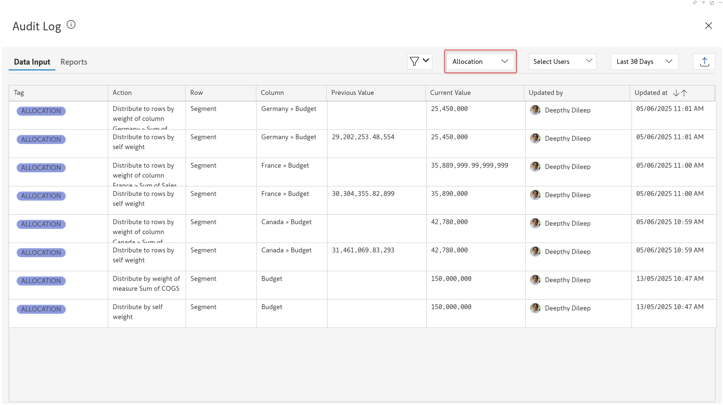 Data input: Captures updates made to data input fields, like value updates and allocations.