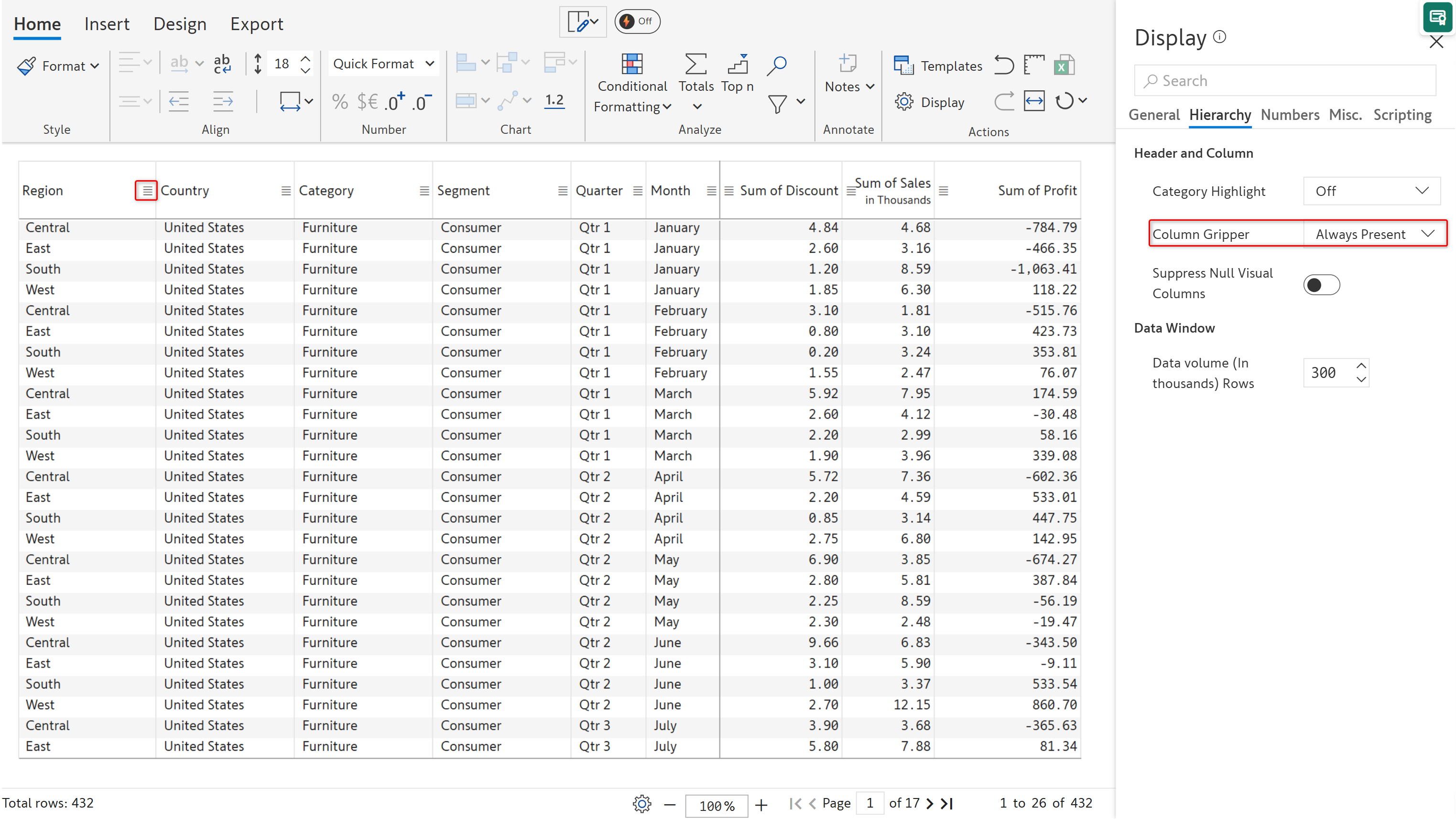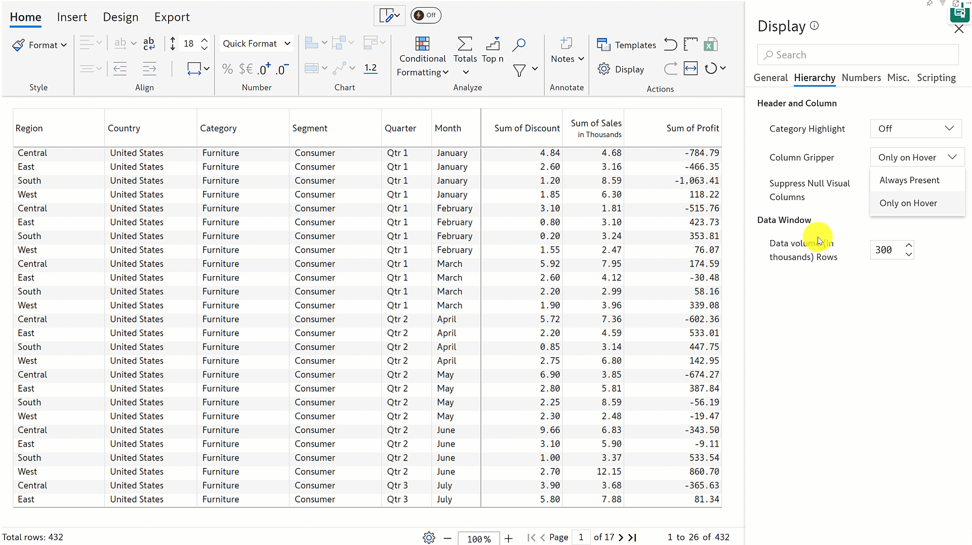 This option controls the visibility of the olumn ripper. When set to nly on Hover, the olumn ripper appears only when you hover over a column. When set to Always Present, the olumn ripper is displayed at all times.