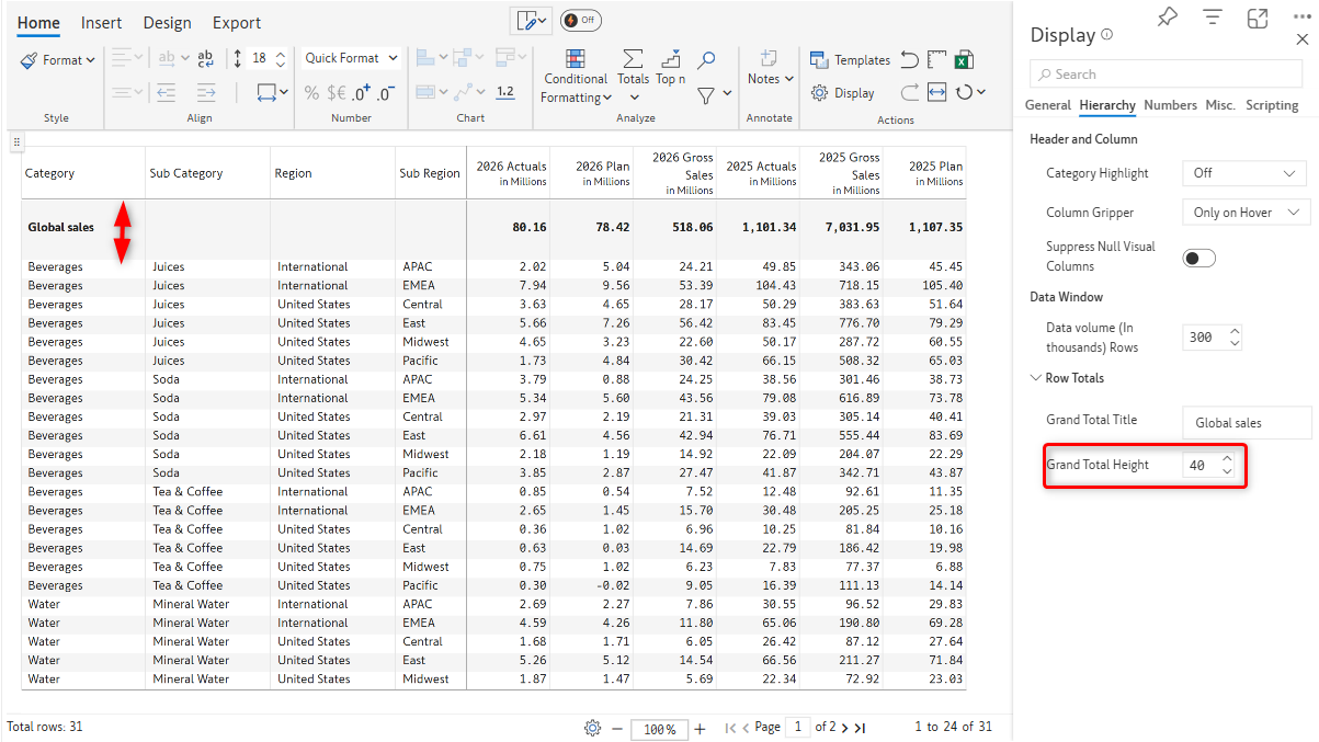 The options related to the grand total are displayed only if the Row Grand Total value has not been set to 'Off' under the Totals option.