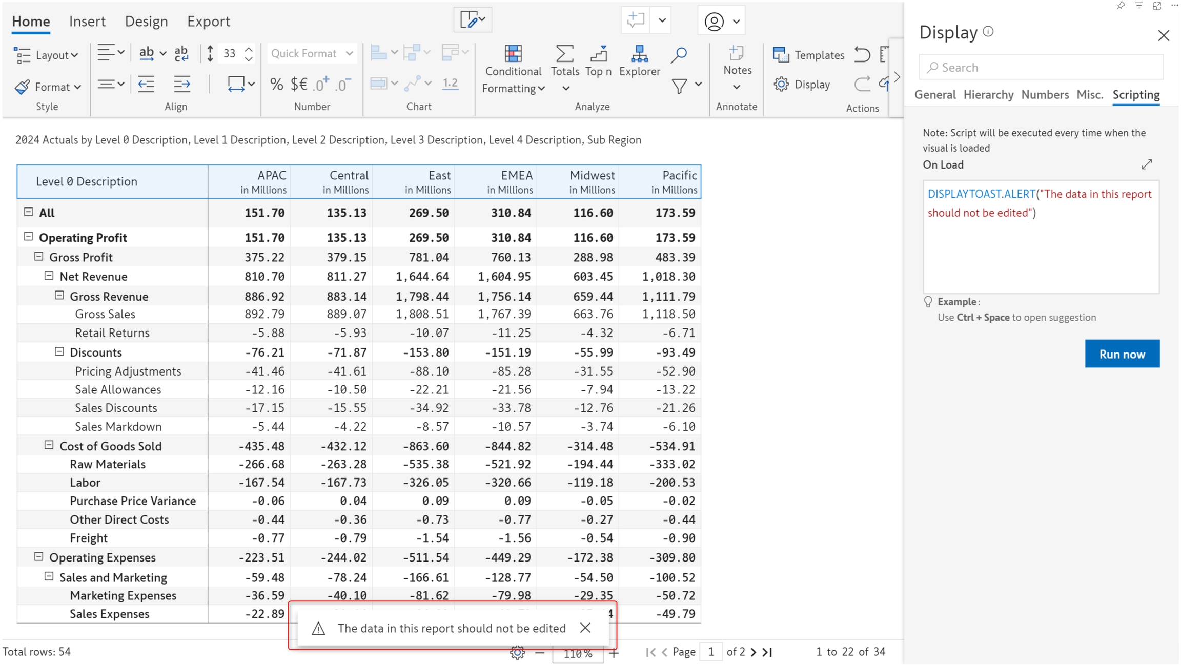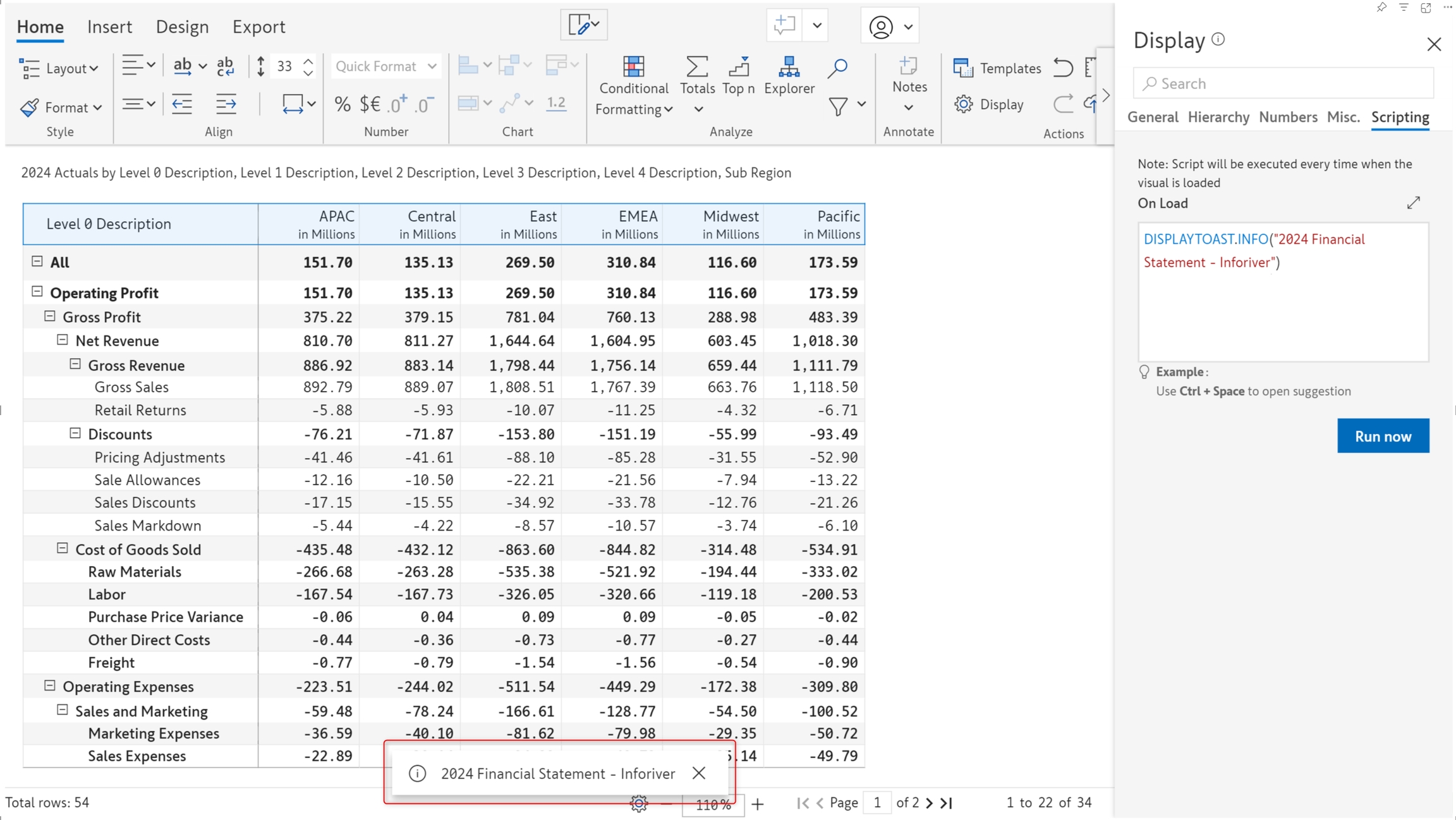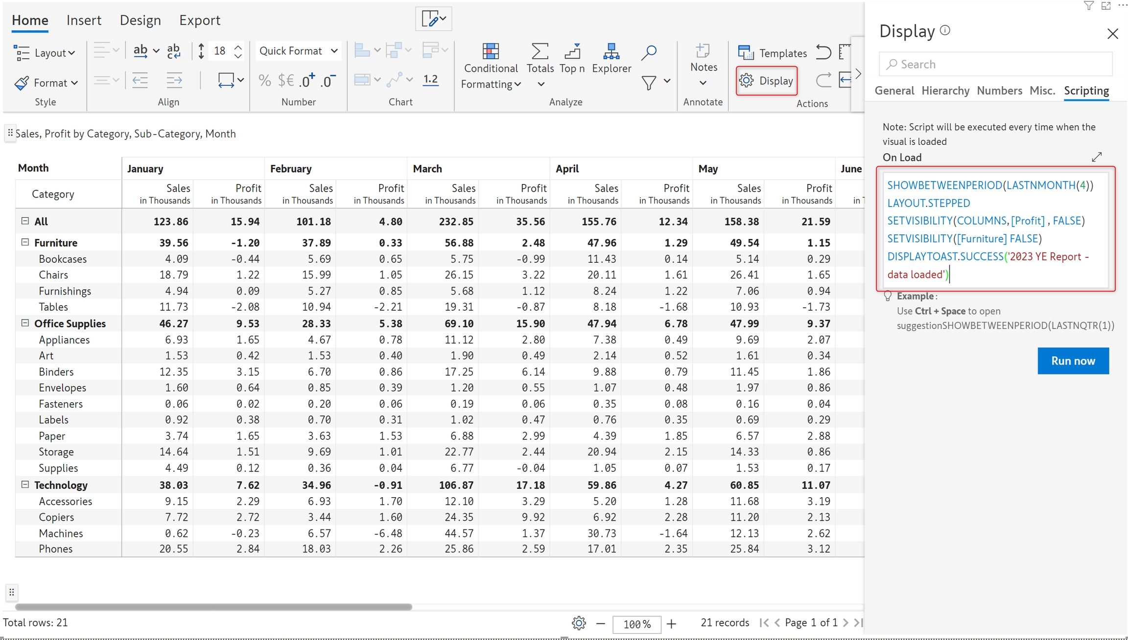Inforiver’s on-load scripting feature enables you to list a set of actions to be performed on loading the visual. You can display messages, set the layout, hide columns, or apply filters as the visual is loaded. The scripts will be executed when you open the report, switch to the tab containing the visual, or refresh the visual.