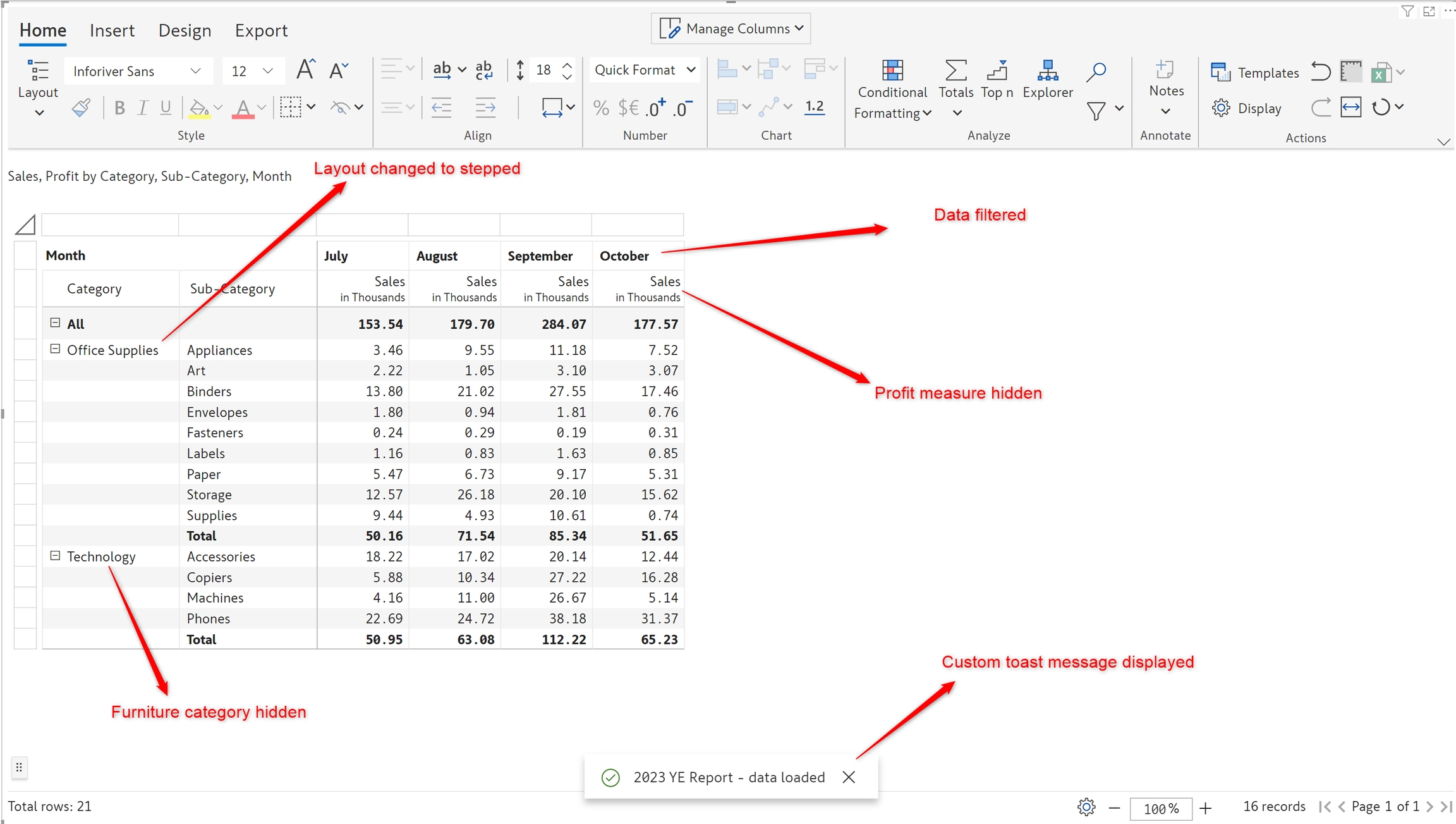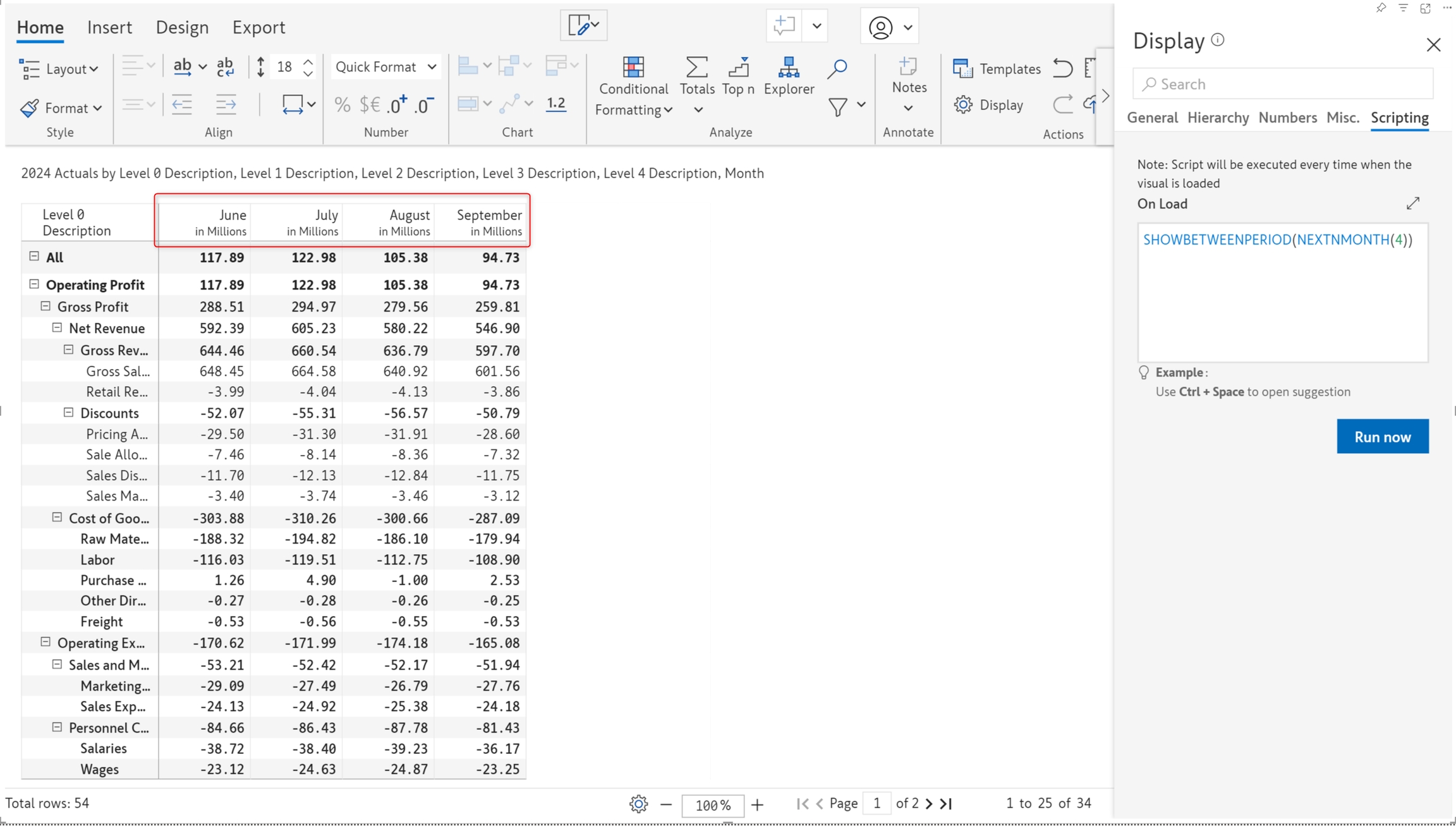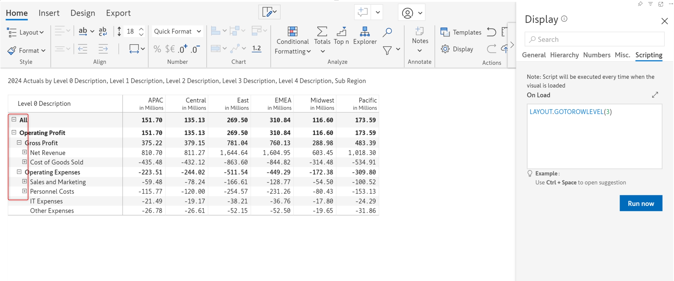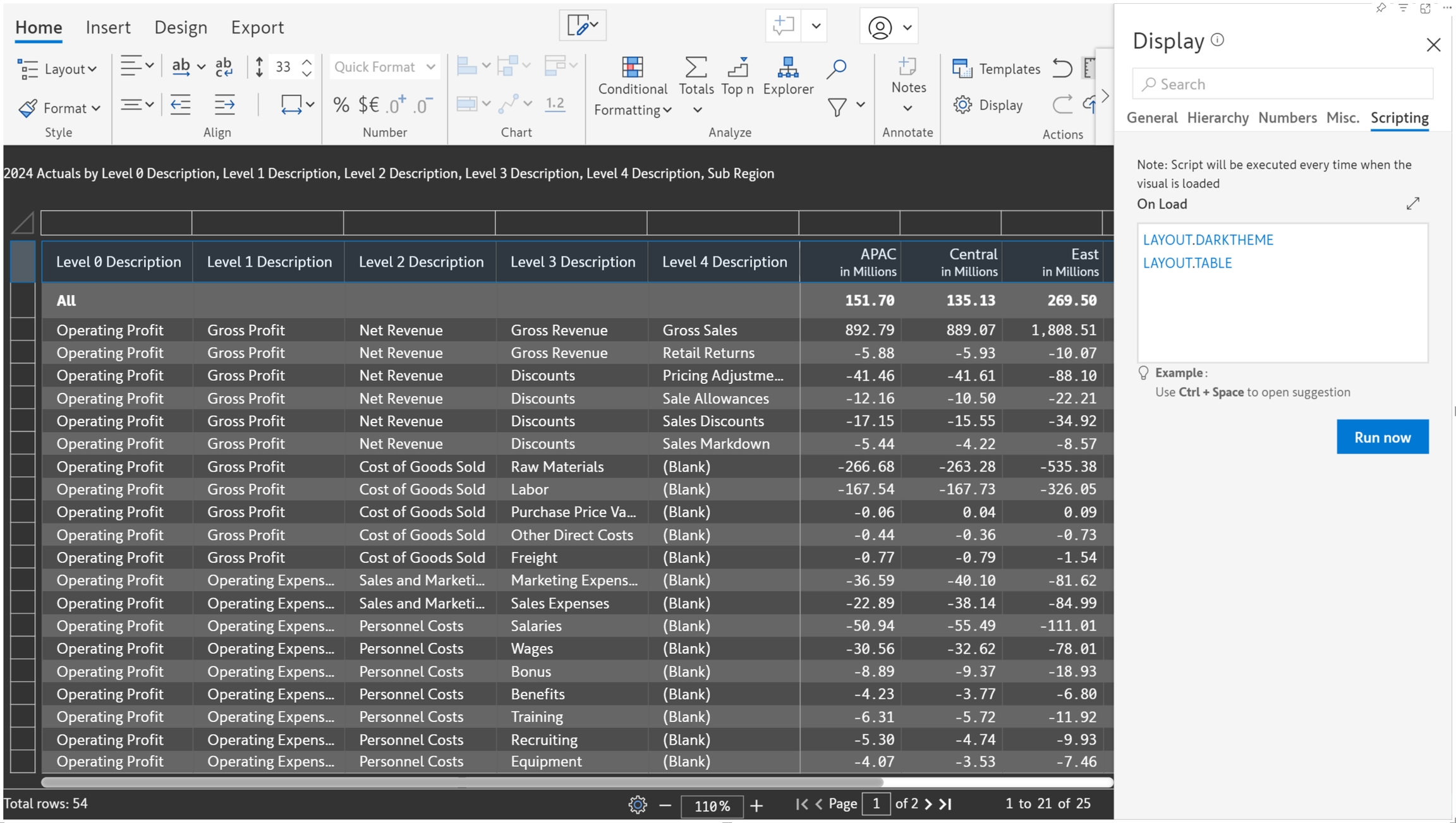 Inforiver’s on-load scripting feature enables you to list a set of actions to be performed on loading the visual. You can display messages, set the layout, hide columns, or apply filters as the visual is loaded. The scripts will be executed when you open the report, switch to the tab containing the visual, or refresh the visual.