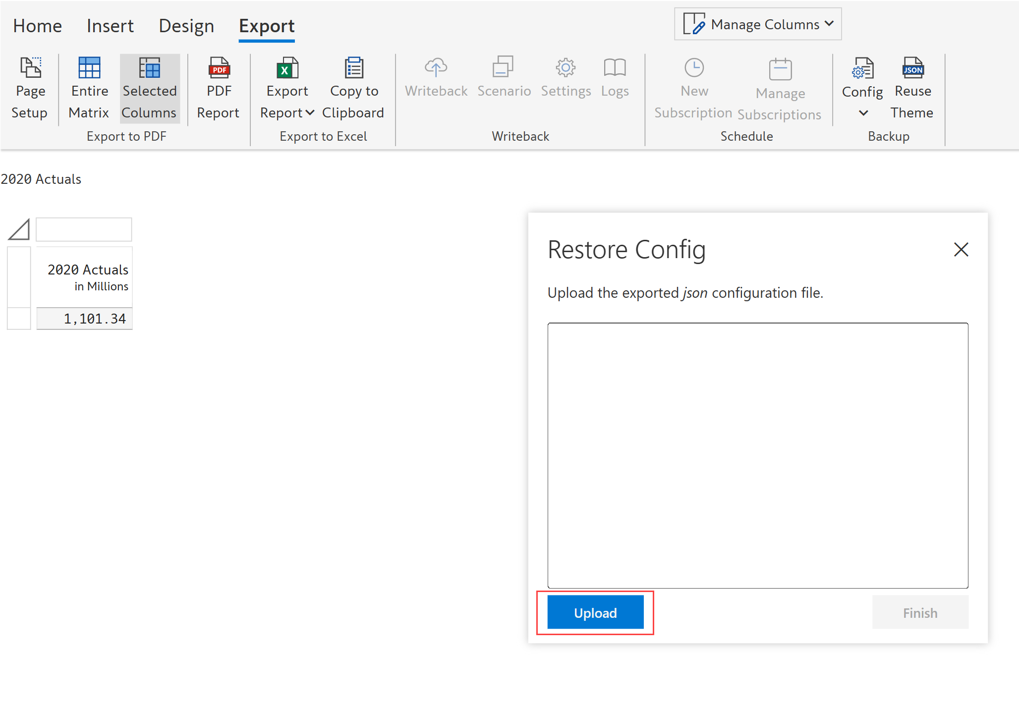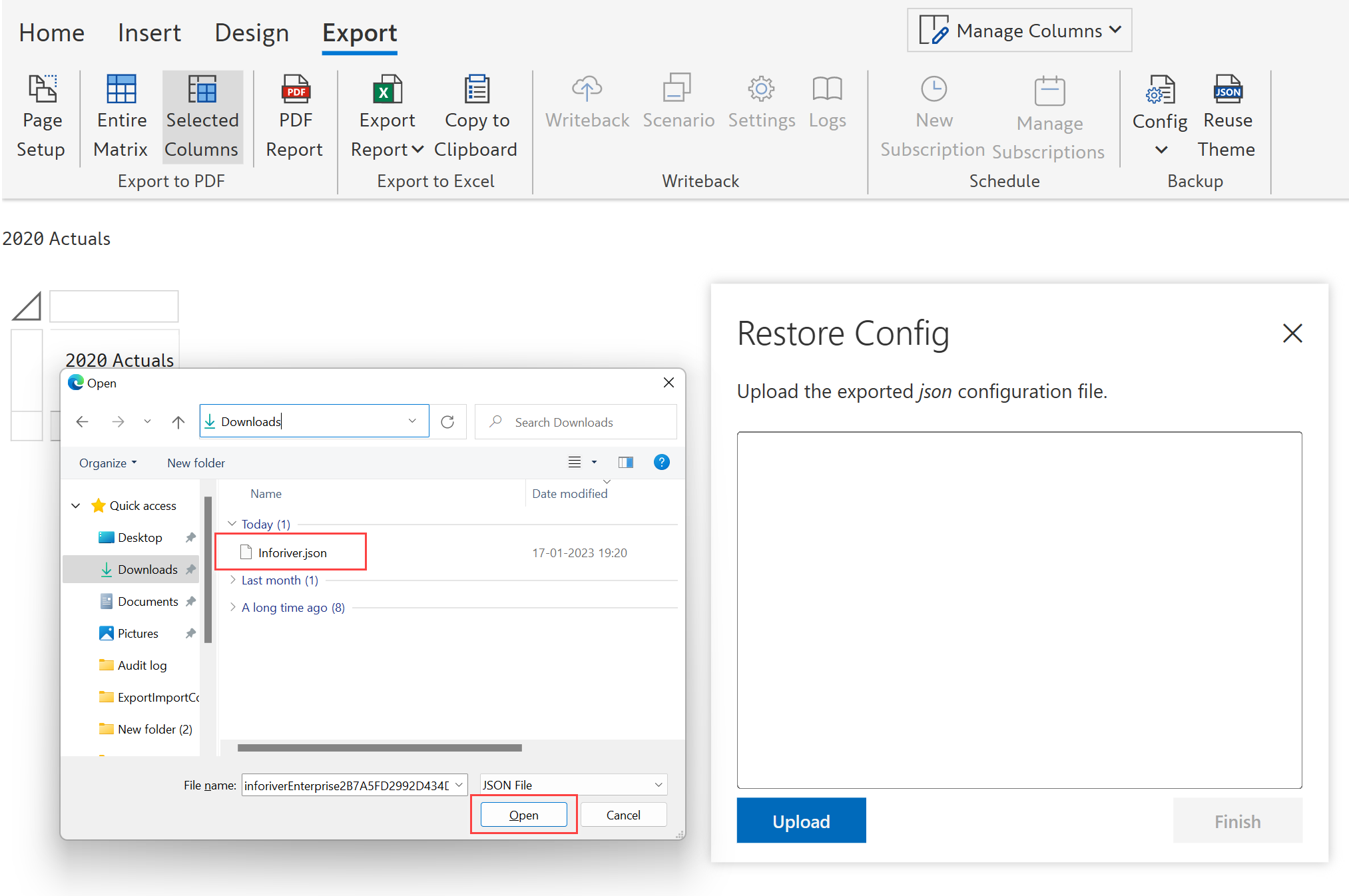 a) To a blank Inforiver visual, add a field to enable it. In the 'Export' tab of the toolbar, Click 'Config' in the 'Backup' section. Select 'Restore report config' from the drop-down.