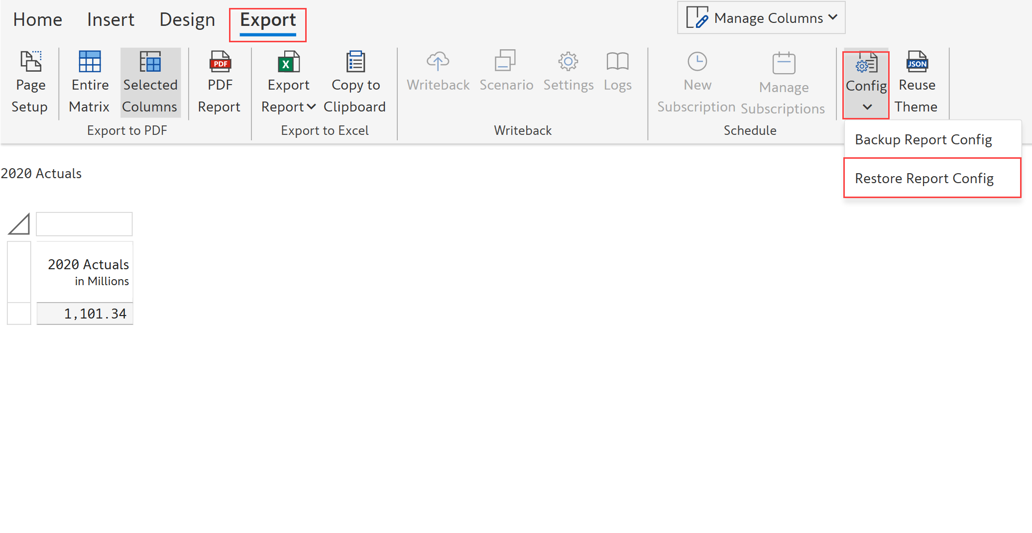 a) In the 'Export' tab of the toolbar, click 'Config' in the 'Backup' section. Select 'Backup report config' to backup configurations.