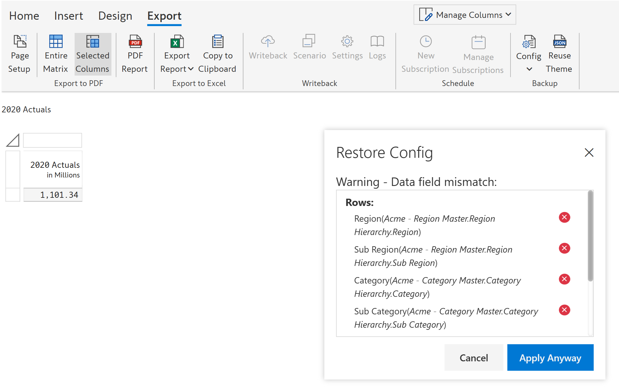 Even if the added data fields are not an exact match, you can still apply the configurations by clicking on the 'Apply Anyway' option. &#x20;