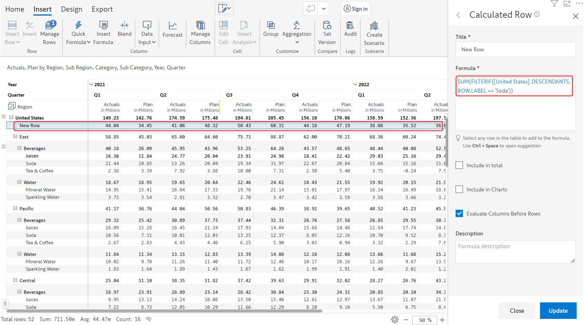 sum(filterif([United States].DESCENDANTS, ROW.LABEL = 'Soda'))The formula above will use FILTERIF to filter all the rows under Region 'United States' with category = 'Soda'. It will then sum up all these values column-wise.