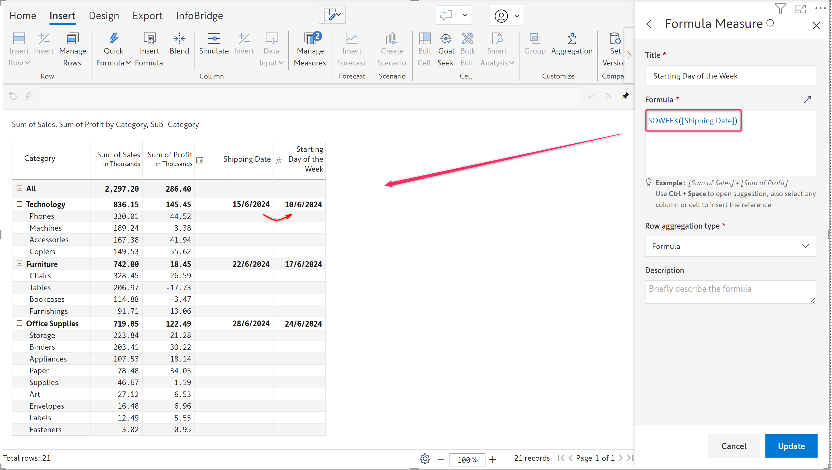 The SOWEEK function takes the date as input and returns the starting date of the week. Node references and measures are also accepted as input arguments. Use [DATE.SET()](https://docs.inforiver.com/premium-table/formula-syntax/date-functions/date.set) to set the format of the output date.