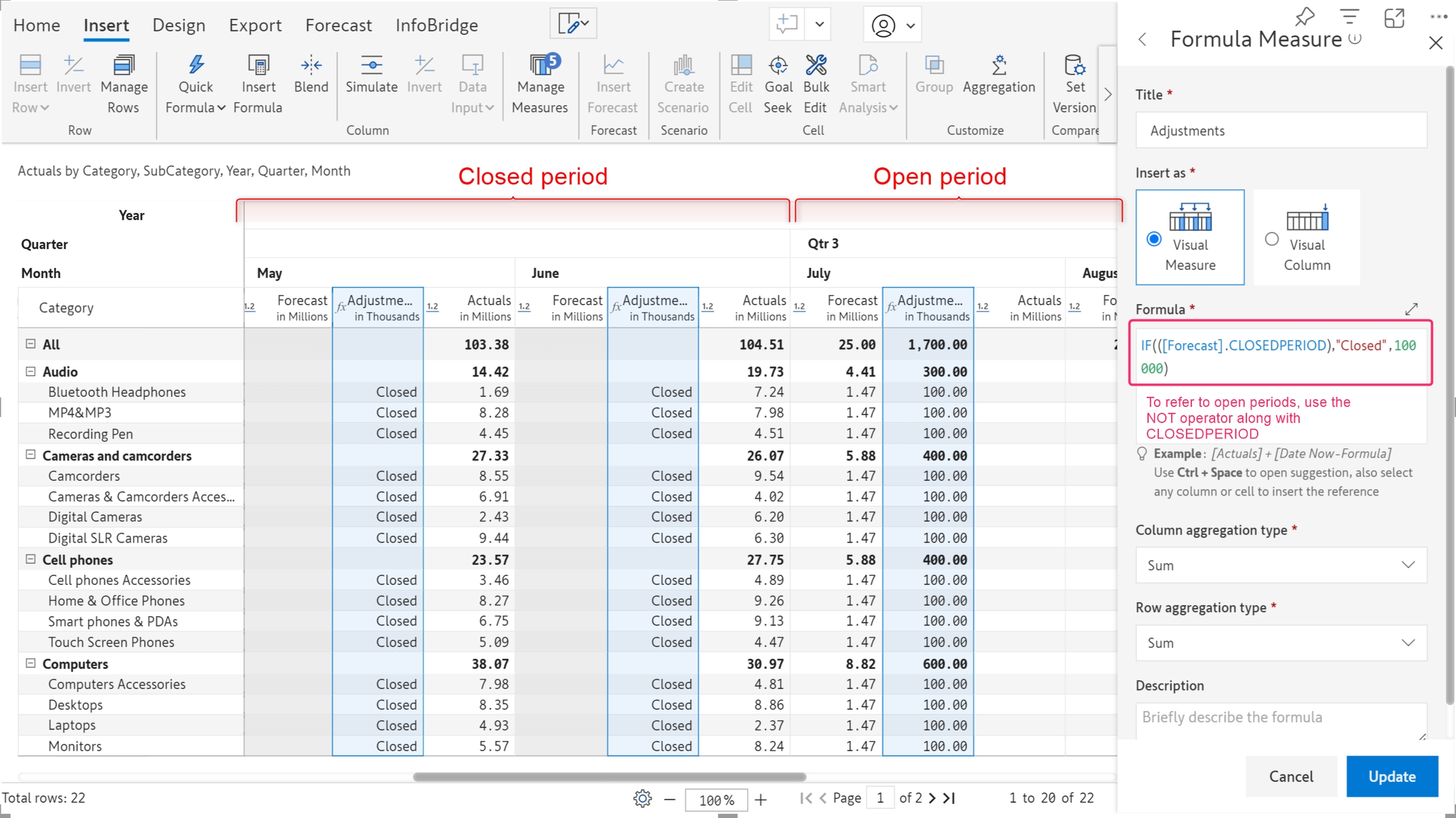 When you need to perform an action specific to the closed or open periods in a forecast, you can use the .CLOSEDPERIOD in conjunction with [Forecast] to refer to the closed periods. To refer to the open periods, use the NOT operator along with the CLOSEDPERIOD function.