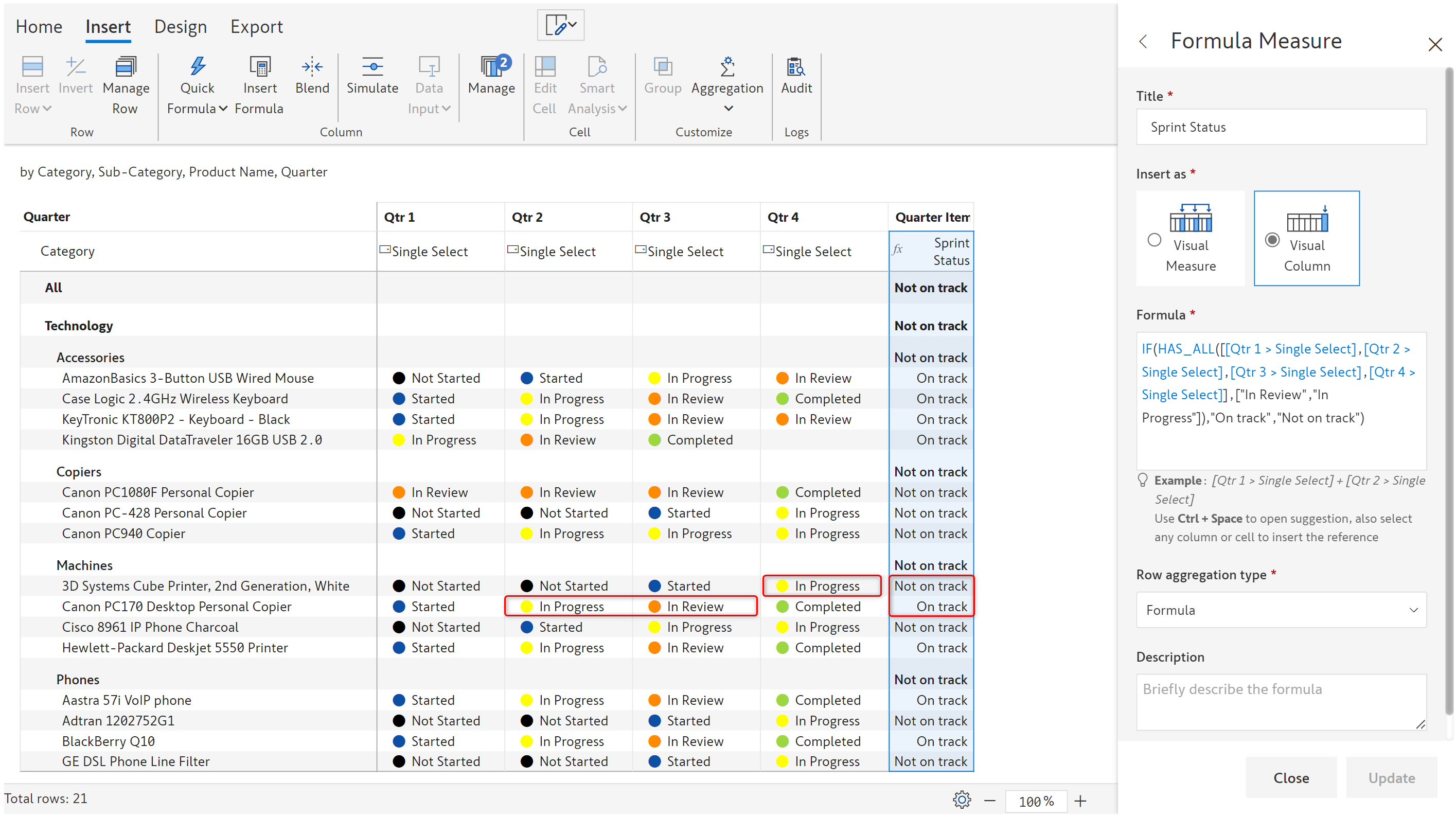 We are tracking the project status across four quarters and if there is at least one quarter where the status is 'In Review' and another quarter where the status is 'In Progress', then the overall status will be updated as 'On track'. Otherwise, it'll be updated to 'Not on track'.