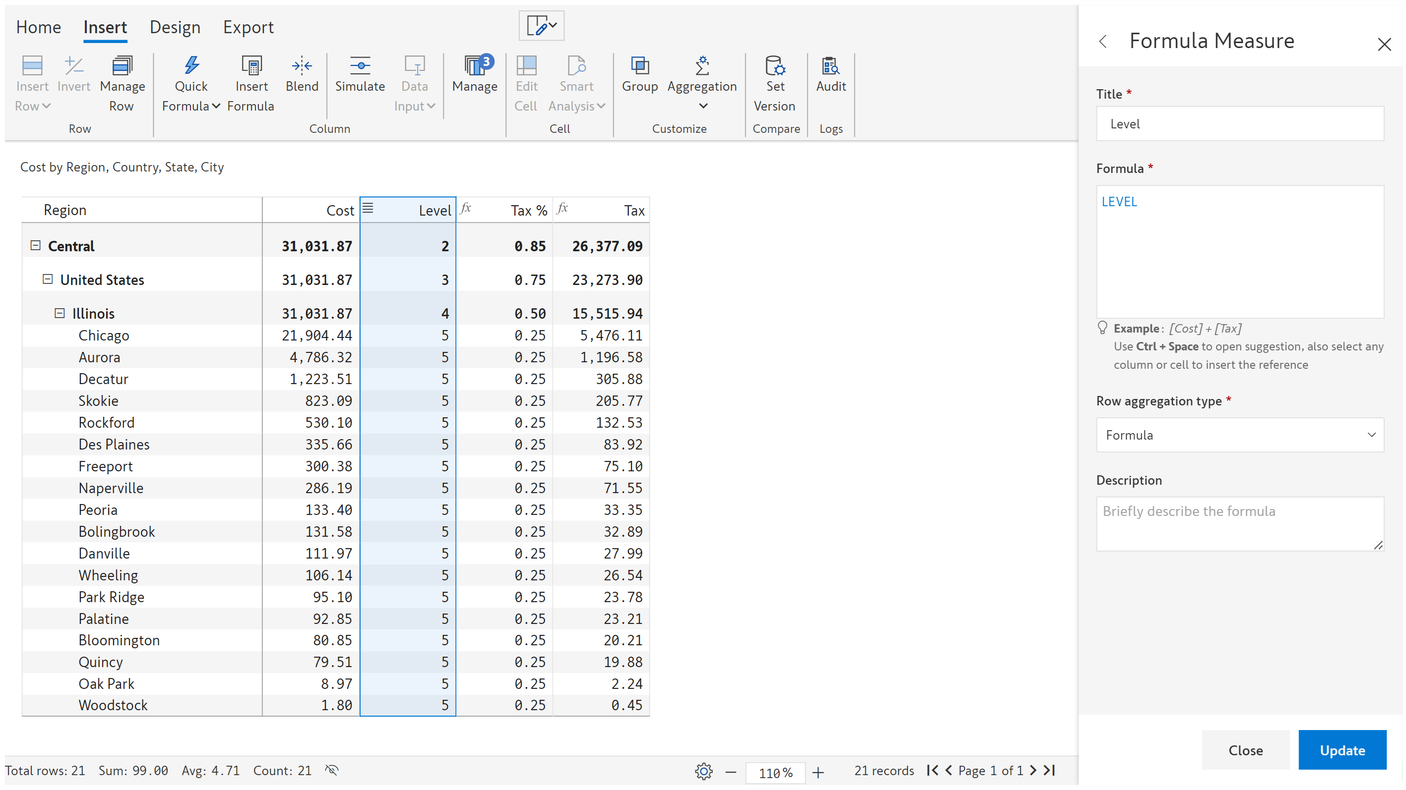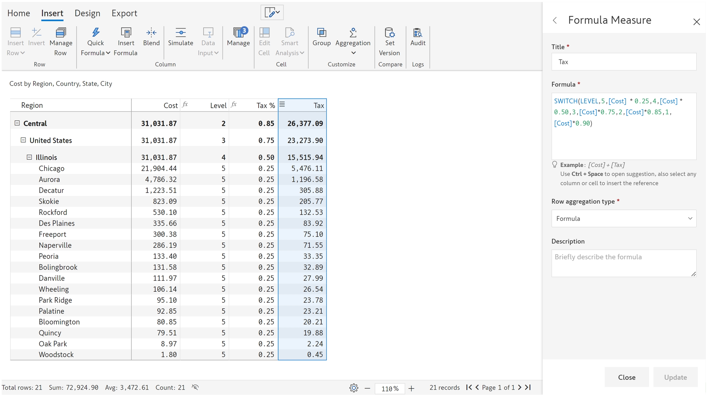For each city, we need to calculate the tax amounts based on level. Using the level formula, we get each hierarchy value and multiply it with the tax% value to arrive at the tax value.