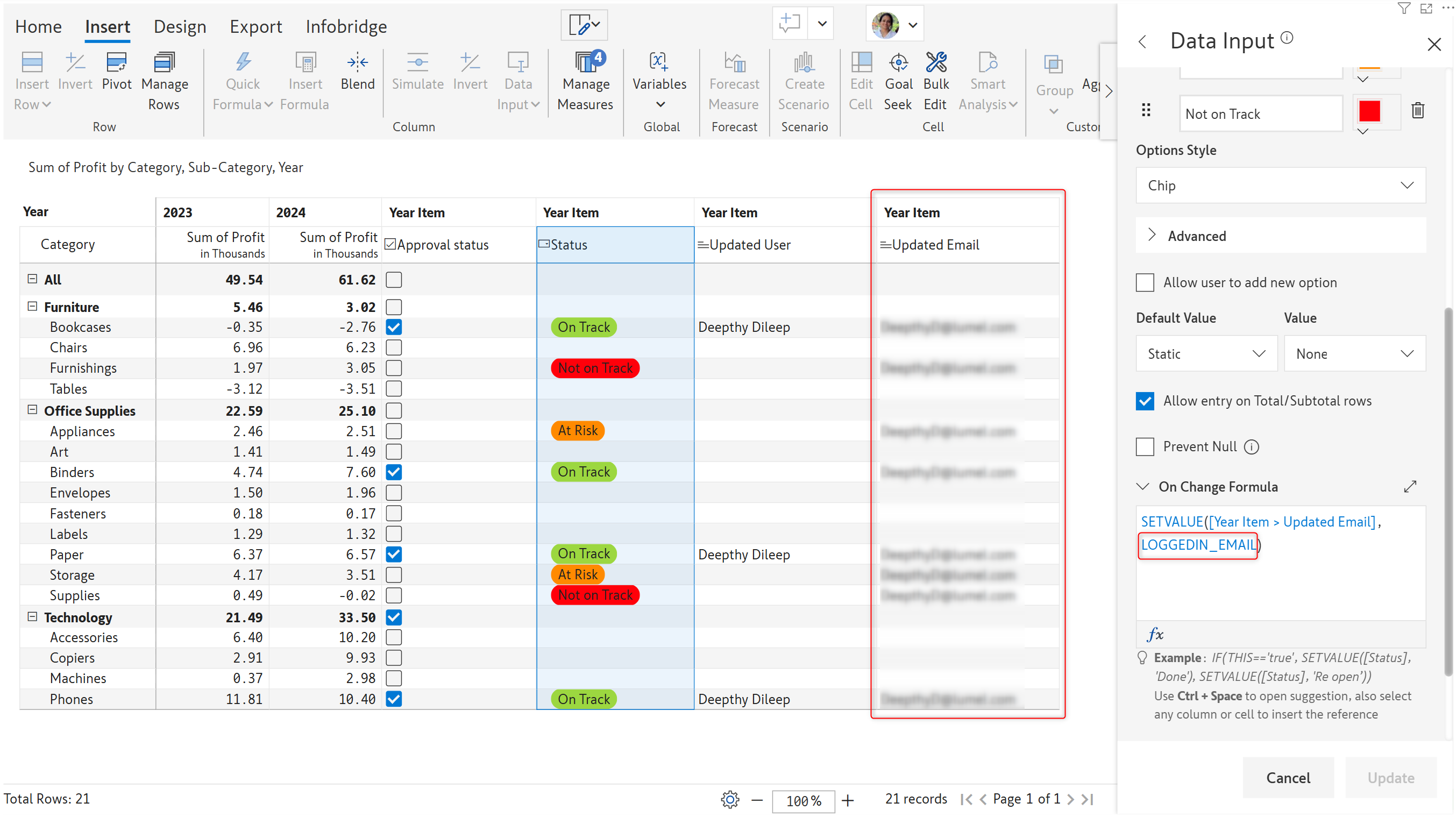 The LOGGEDIN\_EMAIL  identifier returns the user email ID. It can be used along with a SETVALUE function to capture the user who updates a data input field.&#x20;