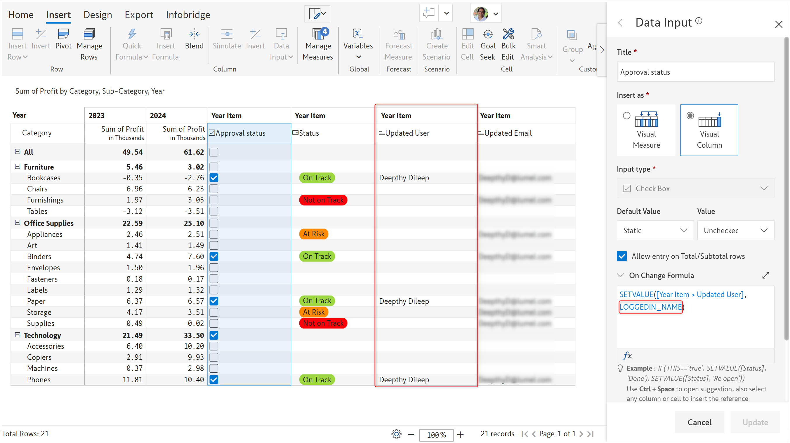 In this example, we're capturing the user name when the approval checkbox is changed. The text fields can then be written back to the preferred destination(s).