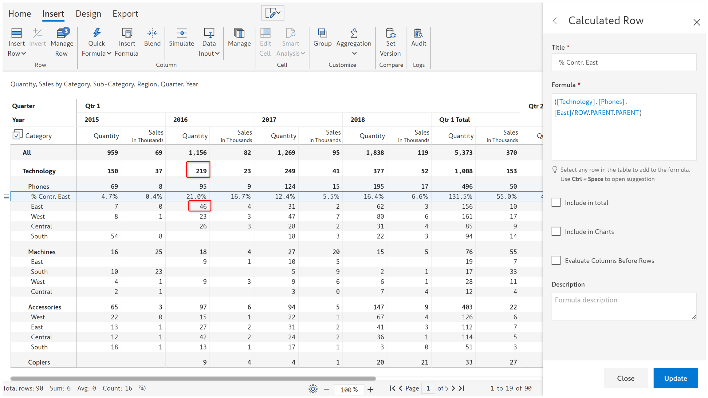 In the below image, you can see that for 2016 Quantity, % Contribution is calculated as 46/219 resulting in 21%.