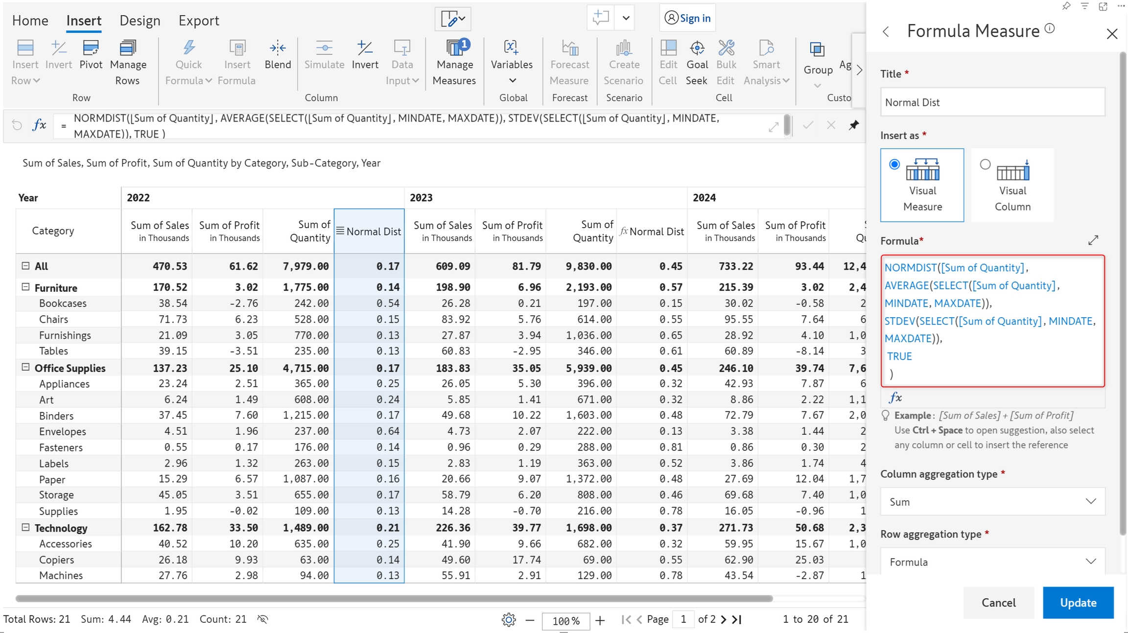 The NORMDIST function calculates the normal distribution for a measure, mean and standard deviation.