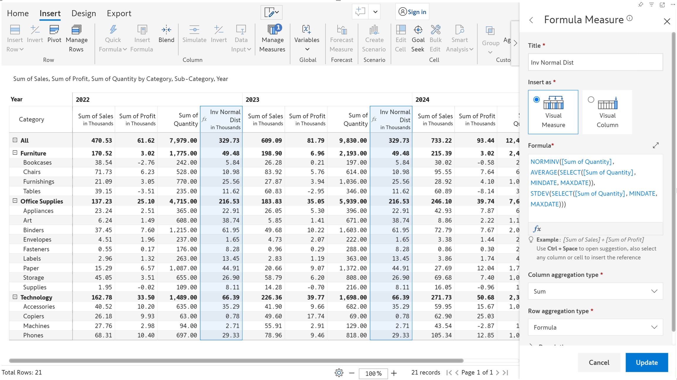 The NORMINV function calculates the inverse normal distribution for a measure, mean, and standard deviation.