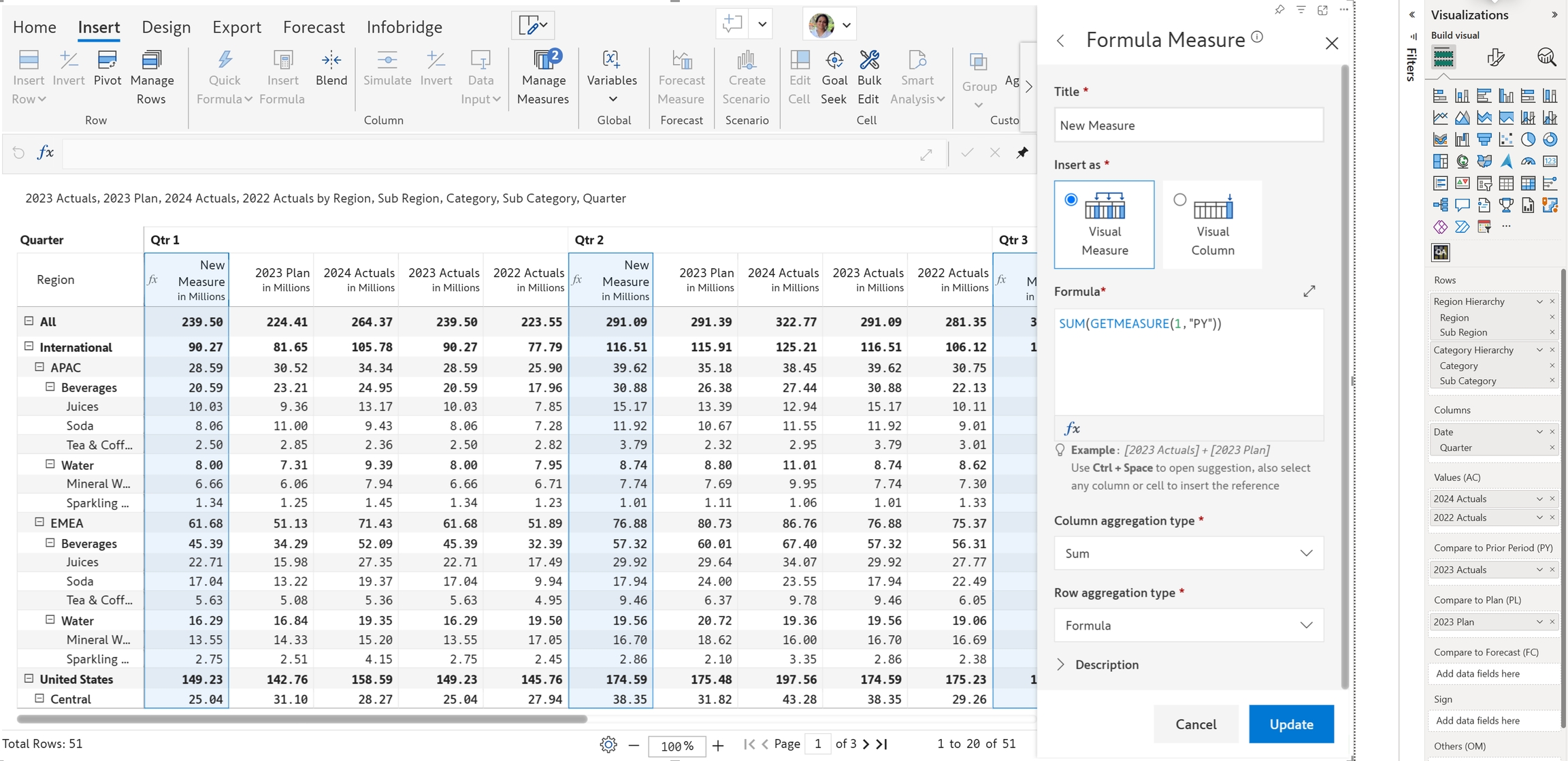 The GETMEASURE function can be used to select data from a native measure based on its index. It should be used with an aggregate function like SUM or AVERAGE.