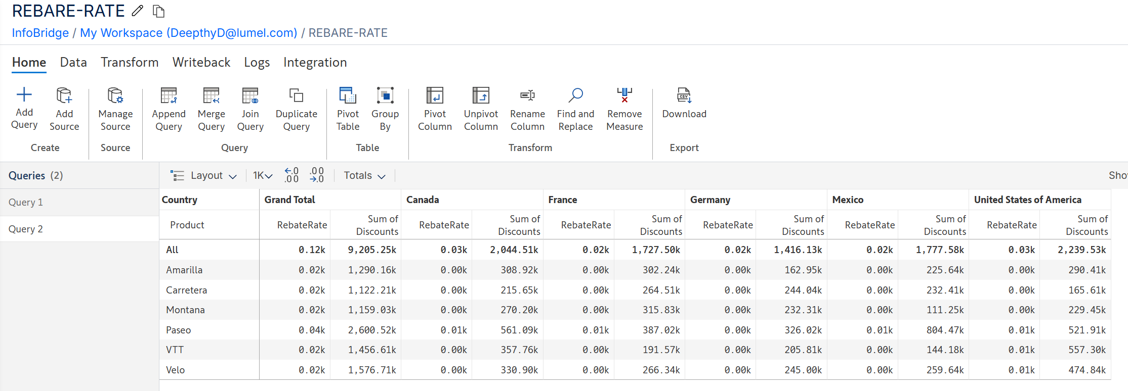 The bridge contains the country-wise rebate rates for a set of products.
