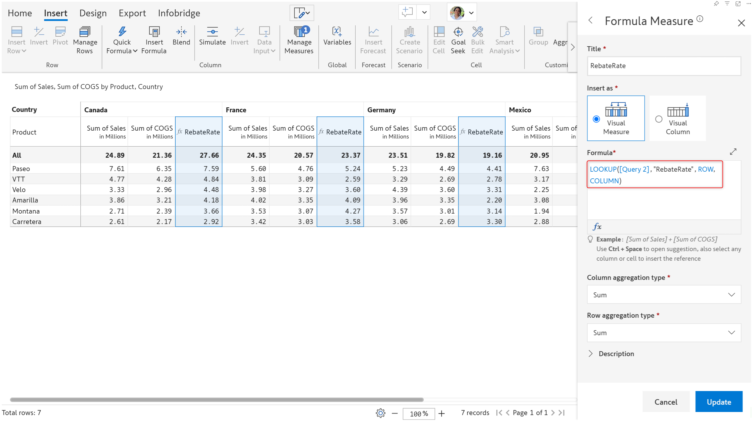 **Example 1:** Refer to a specific row and column and fetch the measure value from Infobridge.