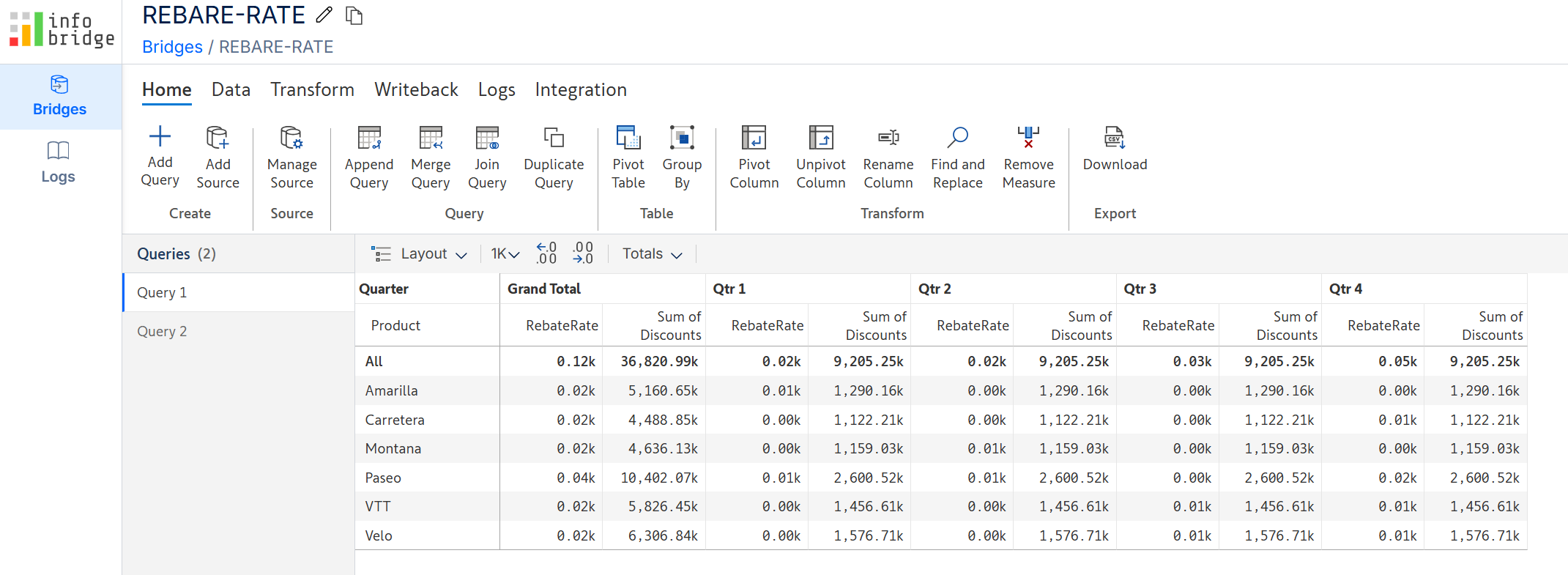 The bridge contains the quarterly rebate rates for a set of products.