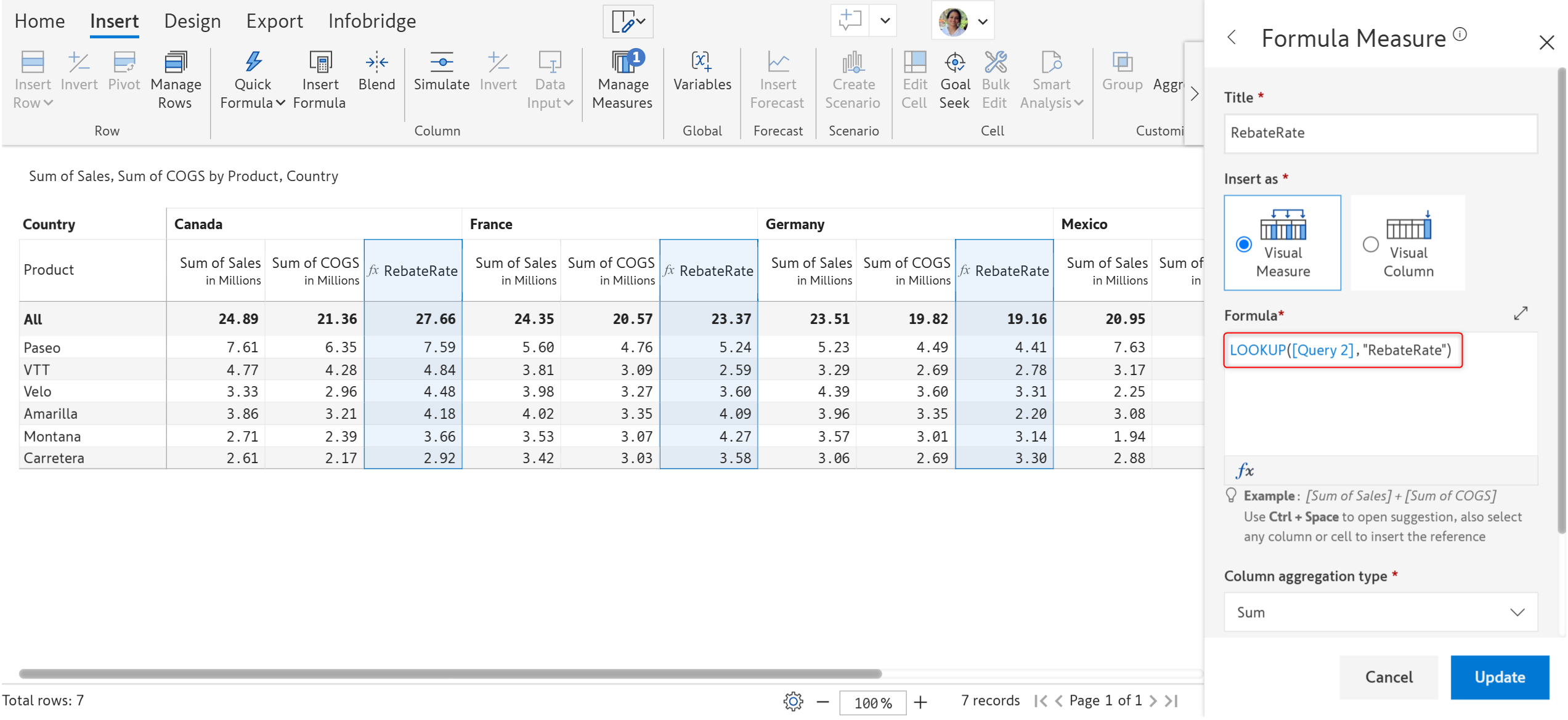 In the target visual, we can pull the rebate rate for the "Velo" product for Q4 using the LOOKUP function as shown.