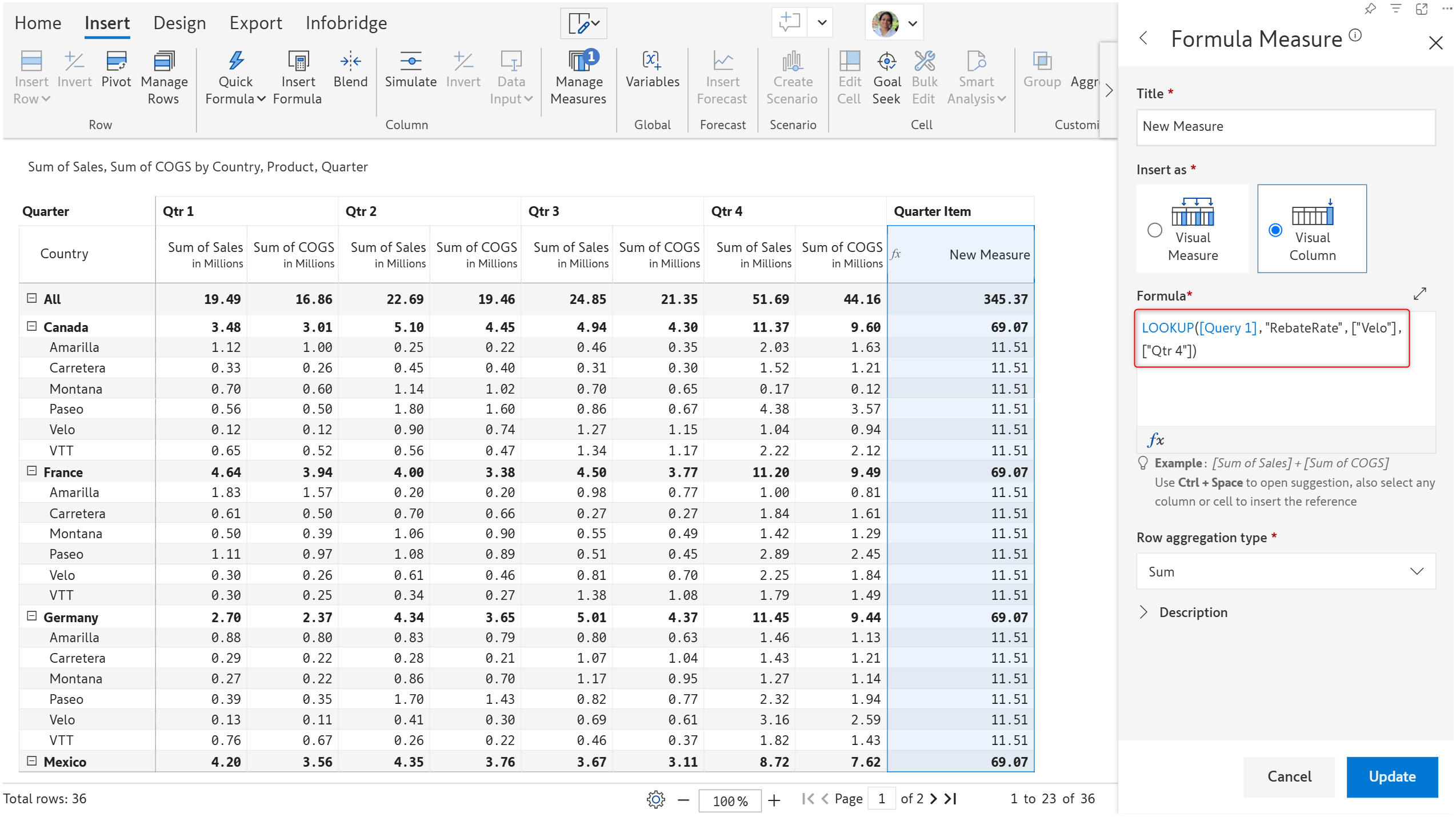 The LOOKUP function can look up values from an Infobridge query and load them inside an Inforiver visual. It can fetch measure values directly from Infobridge without creating an integration and importing measures/rows into your report.