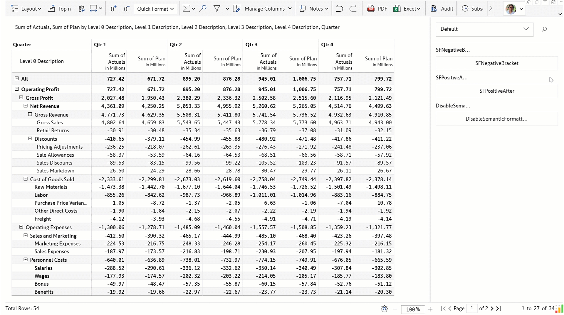 Notice how semantic formatting options have been applied in the reading view for positive and negative numbers using the SEMANTICFORMATTING functions.