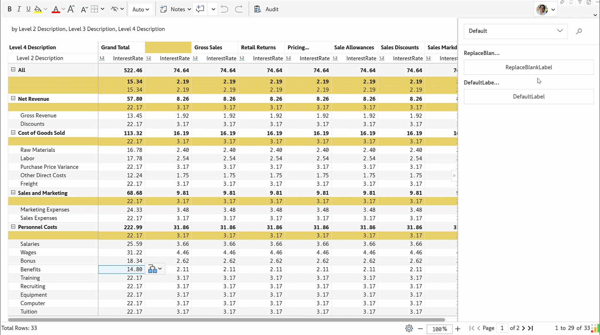Notice how the blank row and column categories are replaced with the custom text "DESC". The buttons use the SETBLANKLABEL script internally.