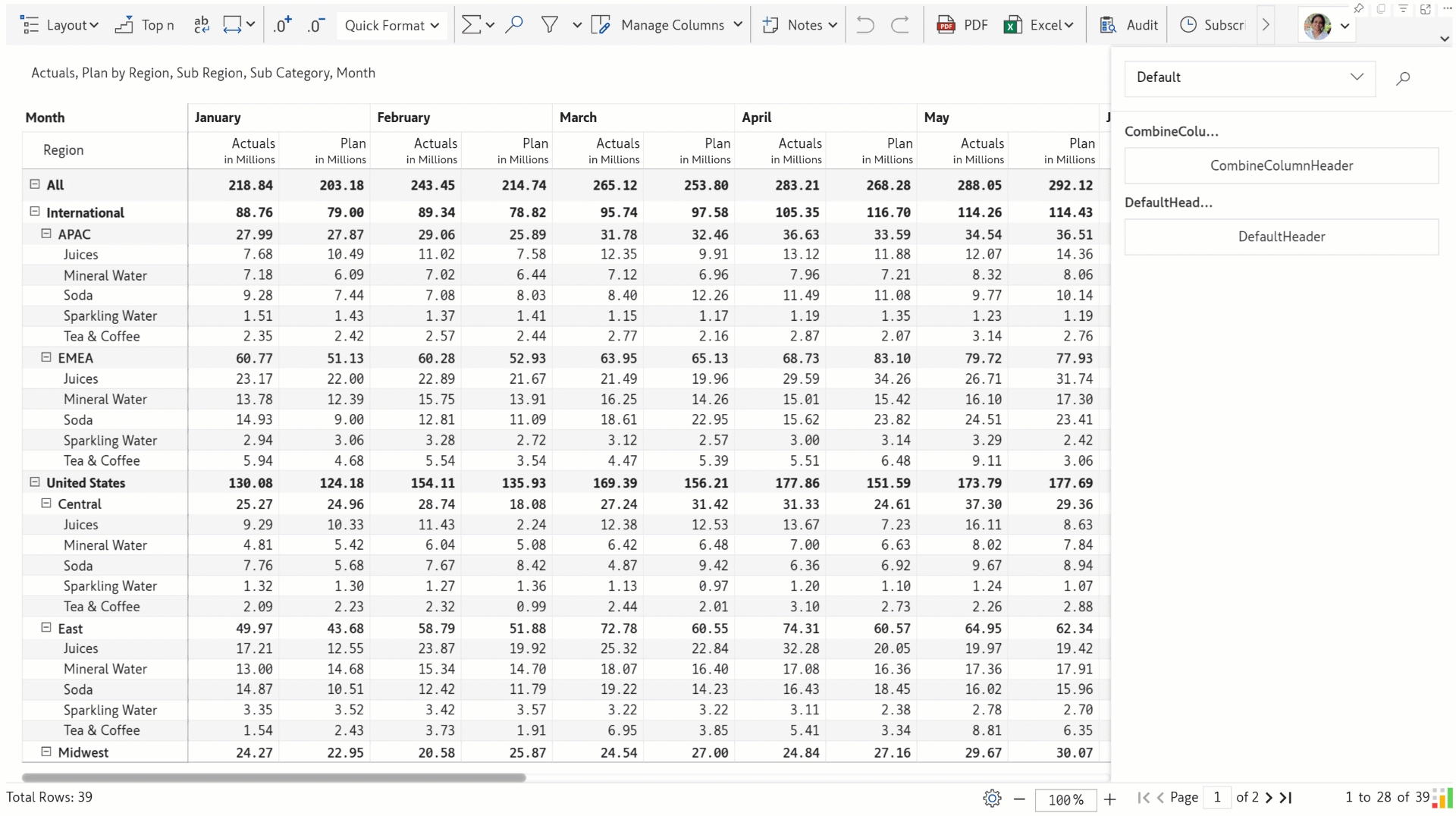 In the animation, the column headers and measure names are combined when the CombineColumnHeader button is clicked. The buttons use the SETCOMBINECOLUMNHEADER function.