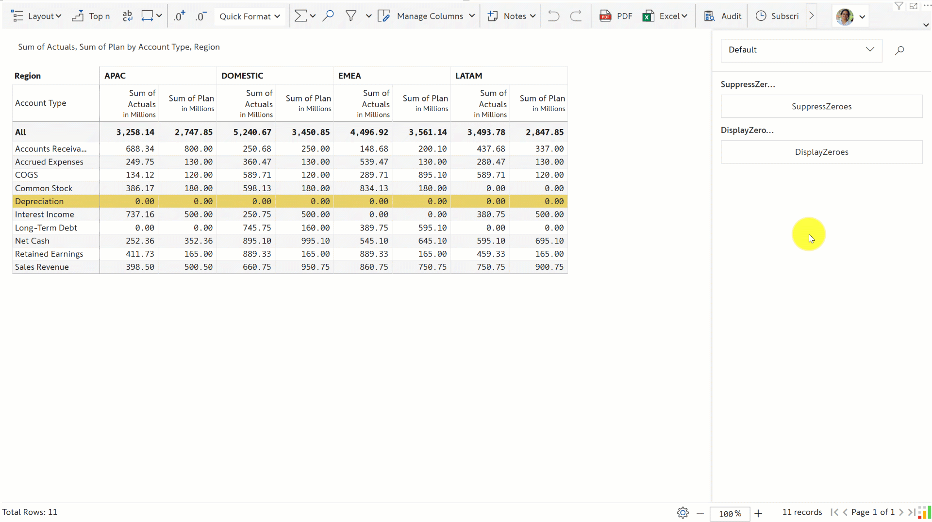 Notice how the *Depreciation* row that only contains zeroes is suppressed when the SuppressZeroes button is clicked and displayed again when the DisplayZeroes button is clicked. The buttons use the SETSUPPRESSZERO script internally to hide and display zero values.