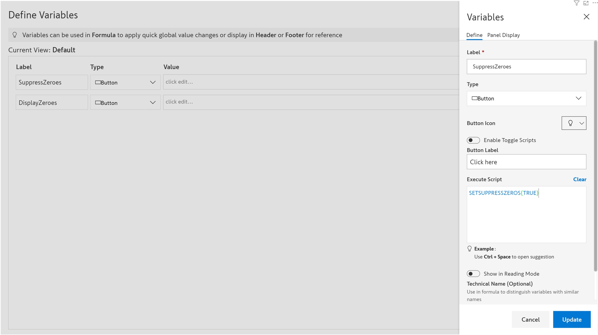 Notice how the Depreciation row that only contains zeroes is suppressed when the SuppressZeroes button is clicked and displayed again when the DisplayZeroes button is clicked. The buttons use the SETSUPPRESSZERO script internally to hide and display zero values.