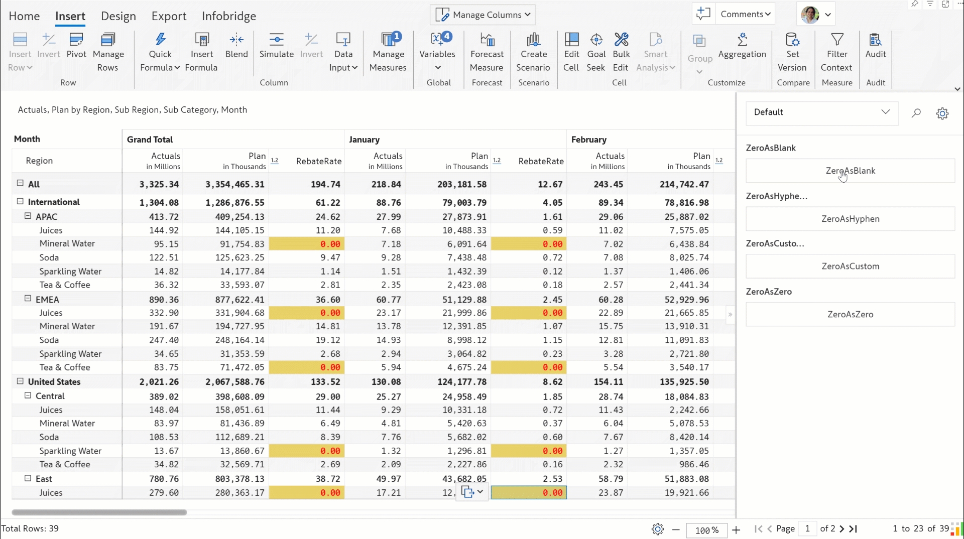 Use the SHOWZEROAS function to customize how to display zeroes in your reports.