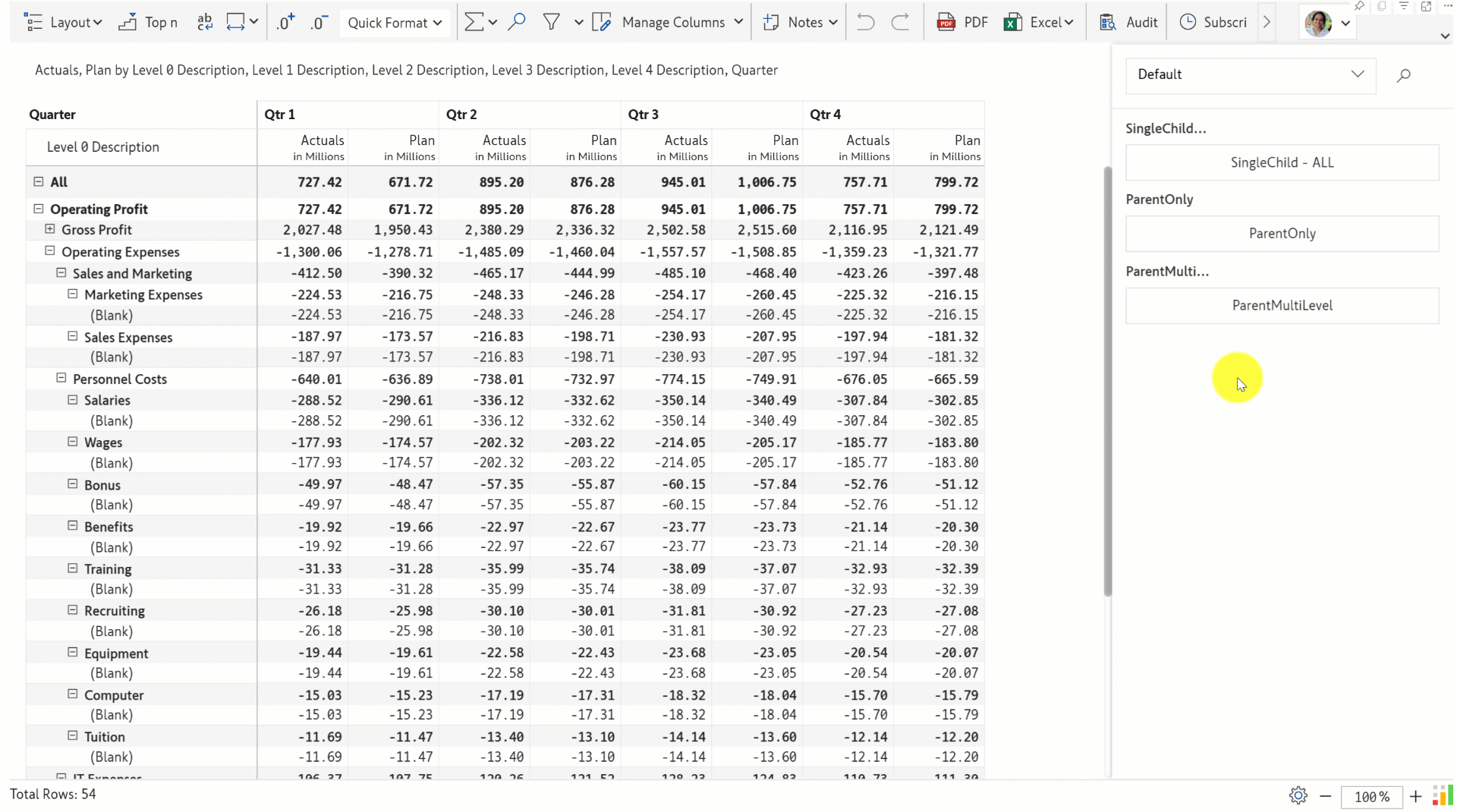Use SINGLECHILD options to select which nodes to display when a parent hierarchy has only one child. [Learn more about single-child options for hierarchies.](https://docs.inforiver.com/premium-table/display-settings/hierarchy-settings#id-4.2.-single-child)