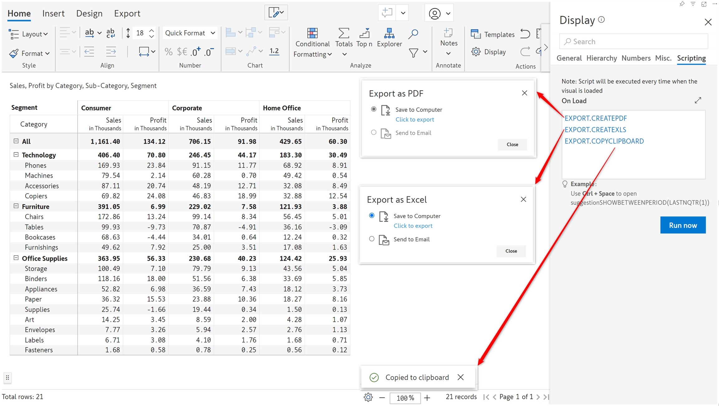 You can export the report to PDF or Excel. You can also copy the report to the clipboard.