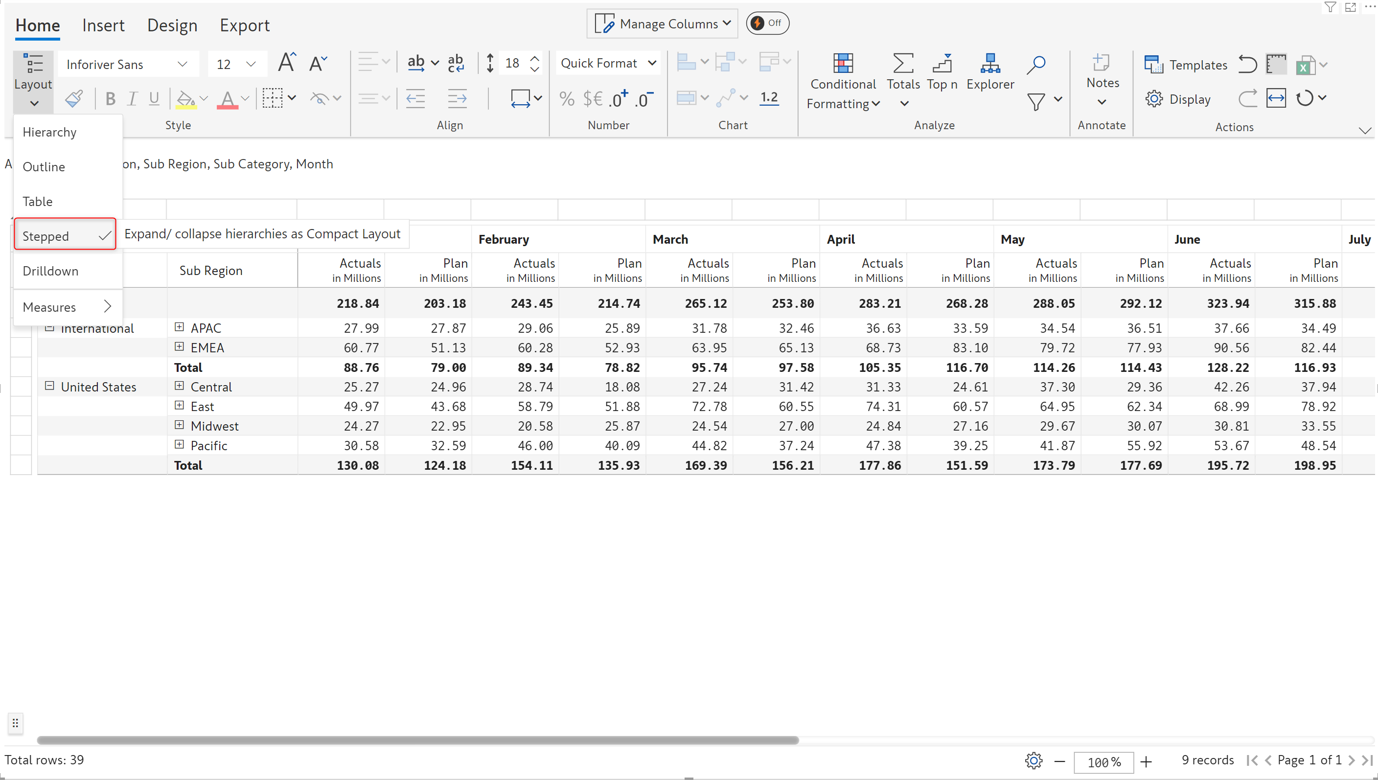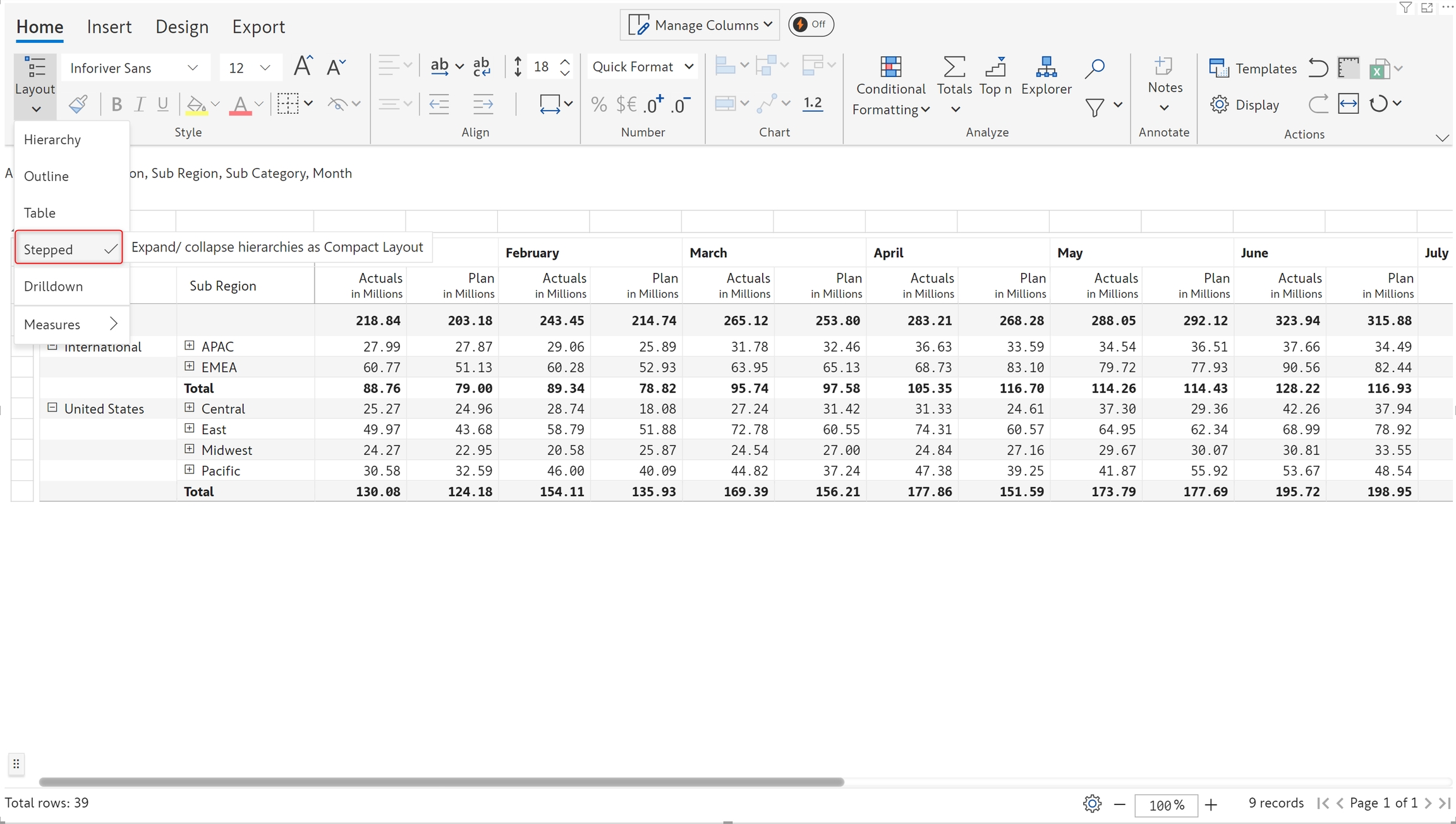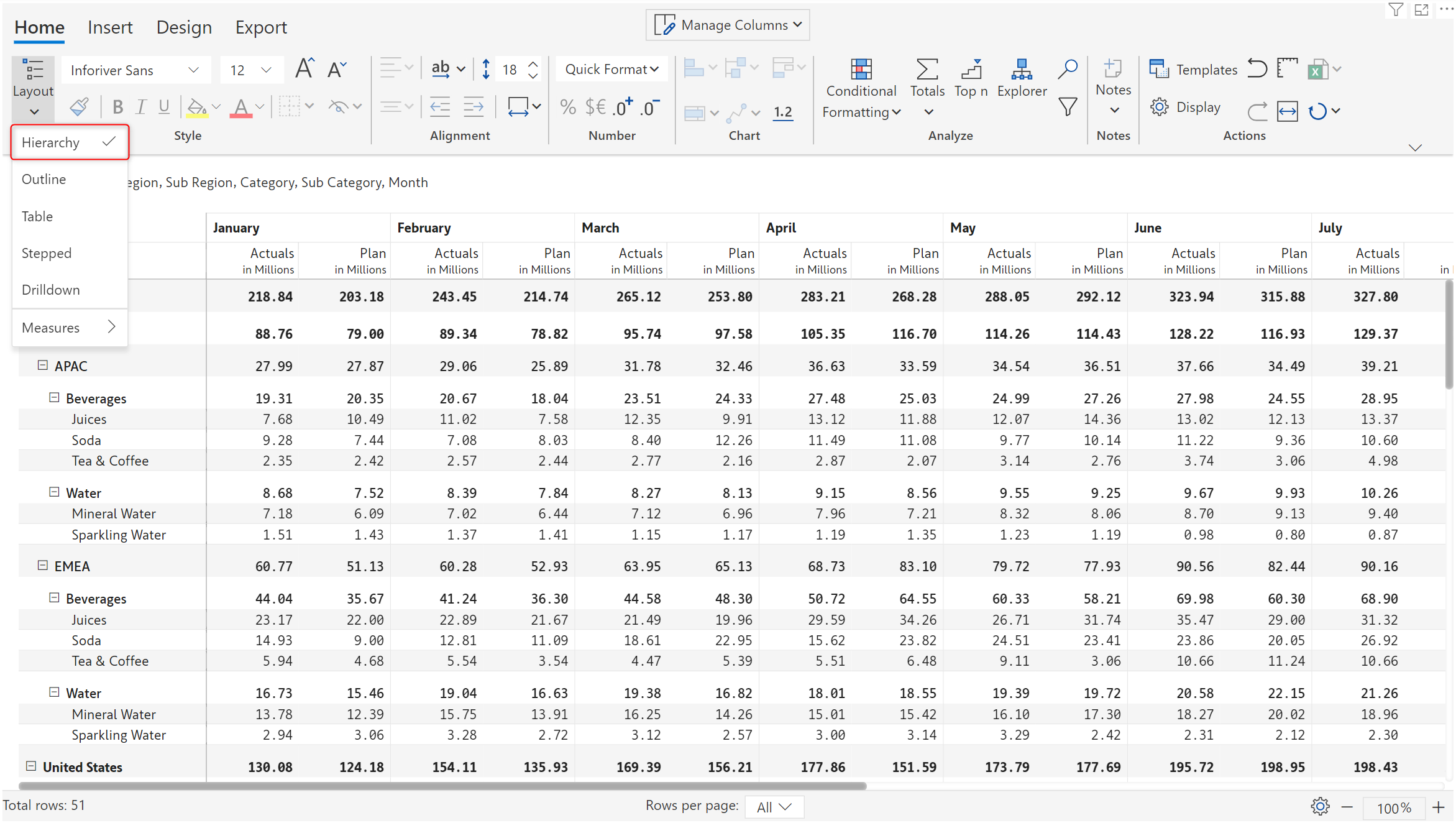 Sets the layout option to hierarchy and displays the data in a hierarchical format.