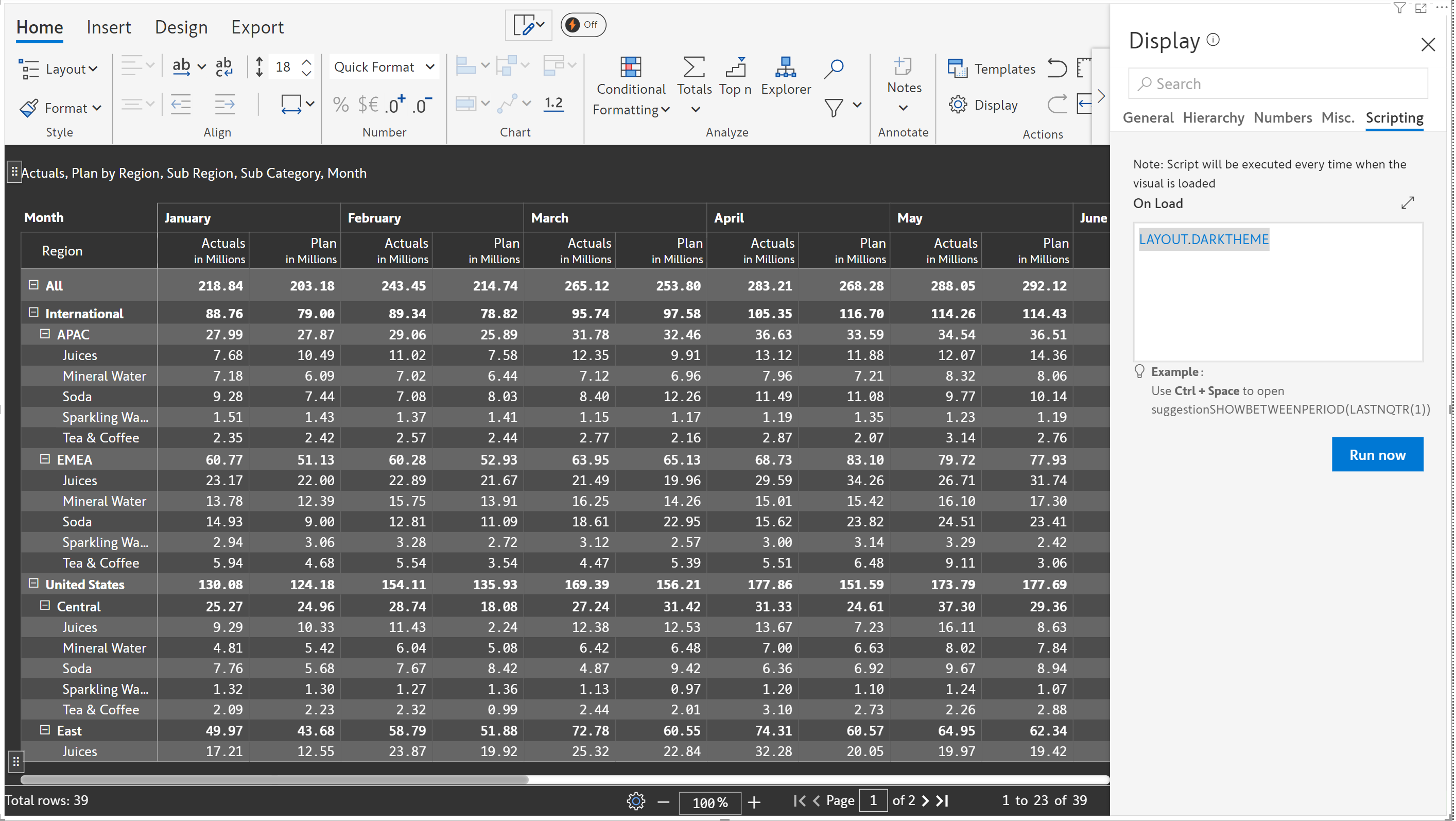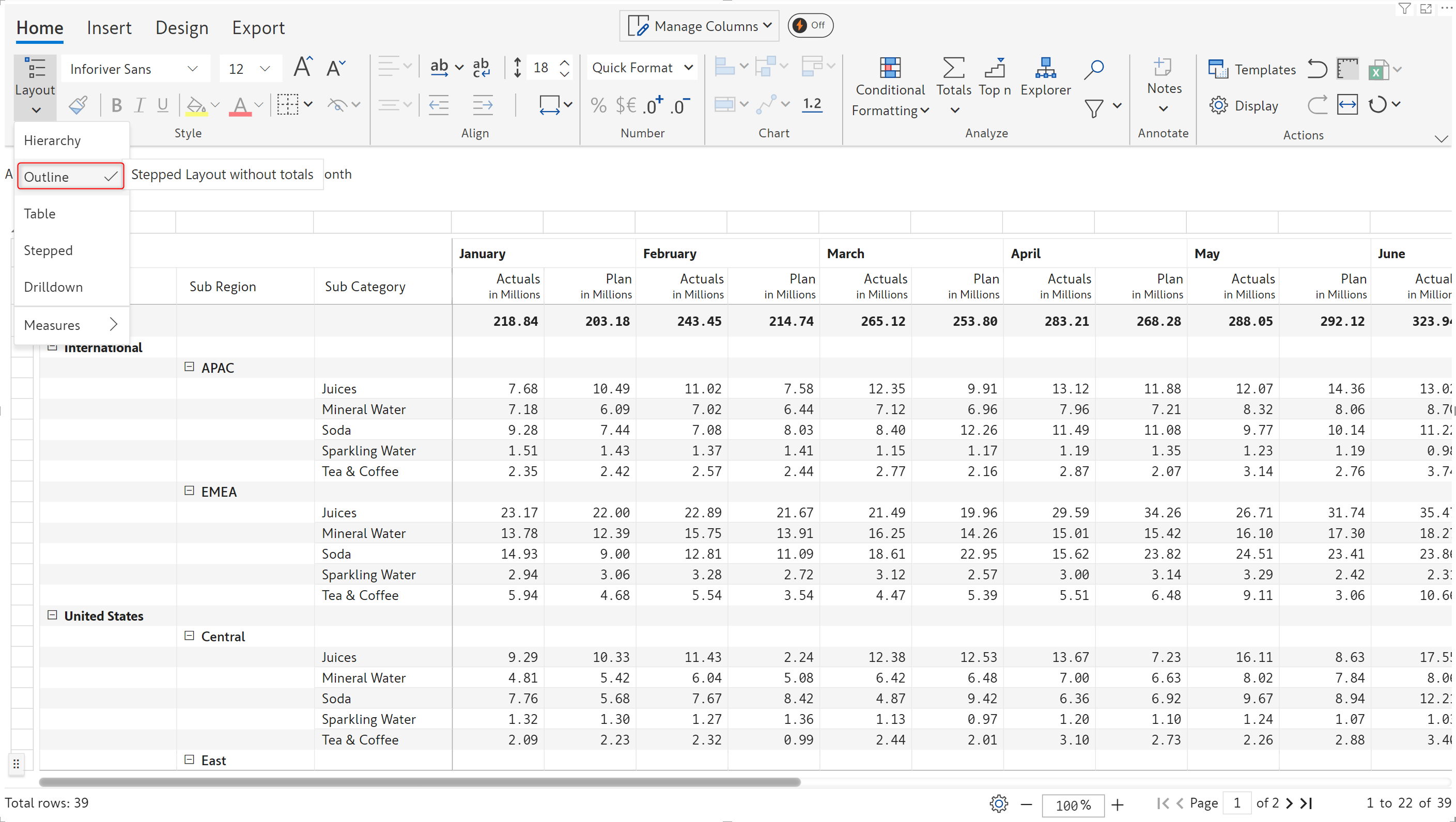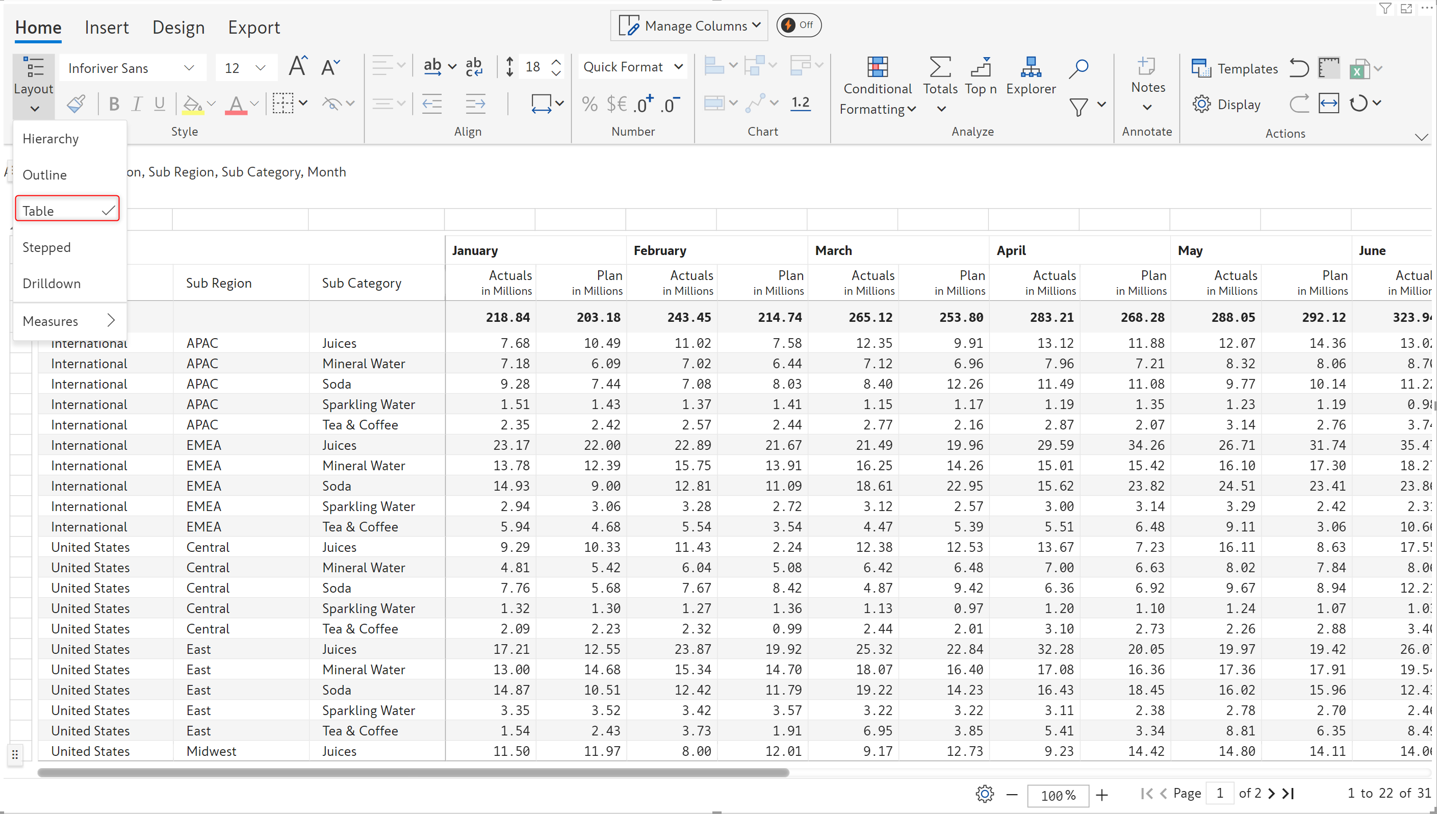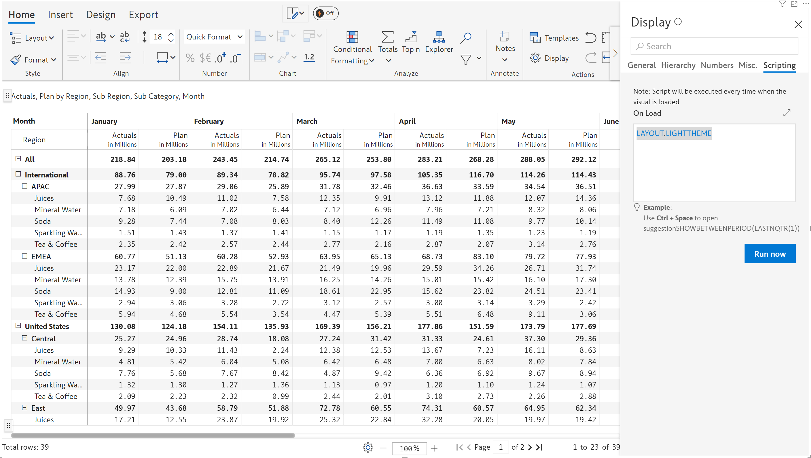 <table><thead><tr><th width="300">NAME</th><th>DESCRIPTION</th></tr></thead><tbody><tr><td><a href="#id-1.-layout.hierarchical">LAYOUT.HIERARCHY</a></td><td>Sets the layout to hierarchy</td></tr><tr><td><a href="#id-2.-layout.outline">LAYOUT.OUTLINE</a></td><td>Sets the layout to outline</td></tr><tr><td><a href="#id-3.-layout.table">LAYOUT.TABLE</a></td><td>Sets the layout to table</td></tr><tr><td><a href="#id-4.-layout.stepped">LAYOUT.STEPPED</a></td><td>Sets the layout to stepped</td></tr><tr><td><a href="#id-5.-layout.drilldown">LAYOUT.DRILLDOWN</a></td><td>Sets the layout to drilldown</td></tr><tr><td><a href="#id-6.-layout.lighttheme">LAYOUT.LIGHTTHEME</a></td><td>Applies a light canvas</td></tr><tr><td><a href="#id-7.-layout.darktheme">LAYOUT.DARKTHEME</a></td><td>Applies a dark canvas</td></tr><tr><td><a href="#id-8.-layout.autofit">LAYOUT.AUTOFIT</a></td><td>Fits the maximum possible data in the available space</td></tr><tr><td><a href="#id-9.-layout.setruler">LAYOUT.SETRULER</a></td><td>Enable or disable the ruler</td></tr><tr><td><a href="#id-10.-layout.gotocolumnlevel">LAYOUT.GOTOCOLUMNLEVEL</a></td><td>Expands the column hierarchy to the specified level</td></tr><tr><td><a href="#id-11.-layout.gotorowlevel">LAYOUT.GOTOROWLEVEL</a></td><td>Expands the row hierarchy to the specified level</td></tr></tbody></table>