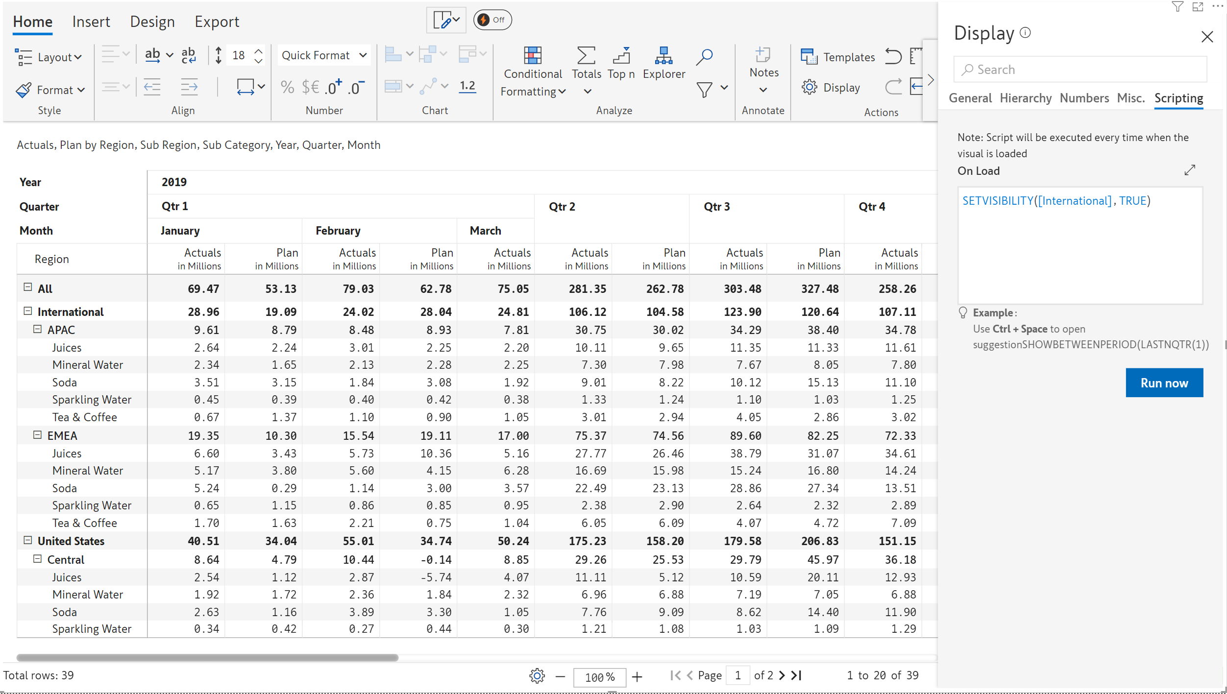 SETVISIBILITY(COLUMNS.[2019 > Qtr 1 > Actuals, FALSE) #Hides the Actuals measure for 2019, qtr 1