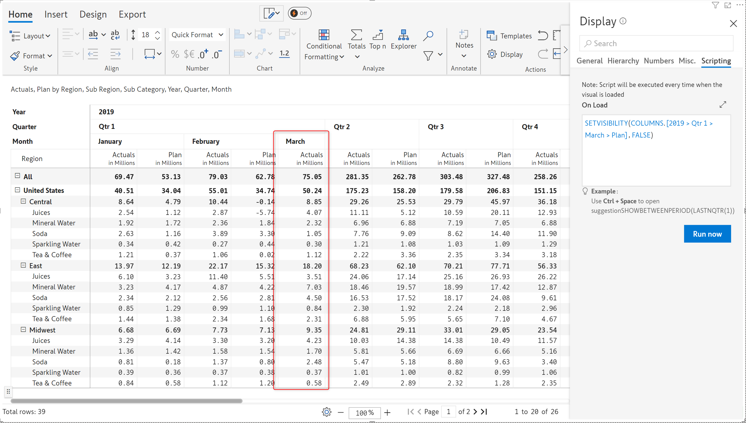 SETVISIBILITY(COLUMNS.[2019 > Qtr 1 > March > Plan, TRUE) #Displays the Plan for 2019, Q1, March