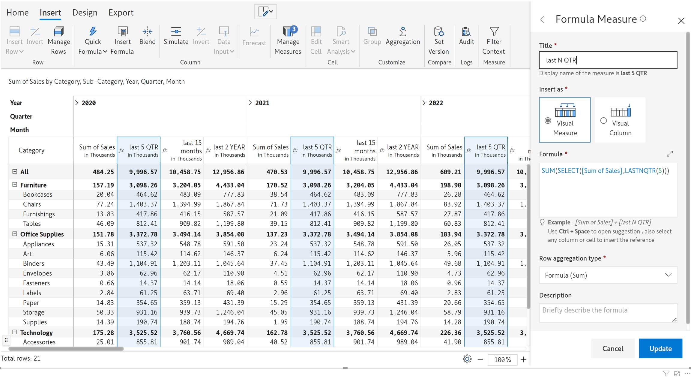 The LASTNQTR function can be used to select data from a given measure, for a specified number of quarters preceding the current quarter. It should be used in conjunction with the SELECT clause and with an aggregate function like SUM or AVERAGE.