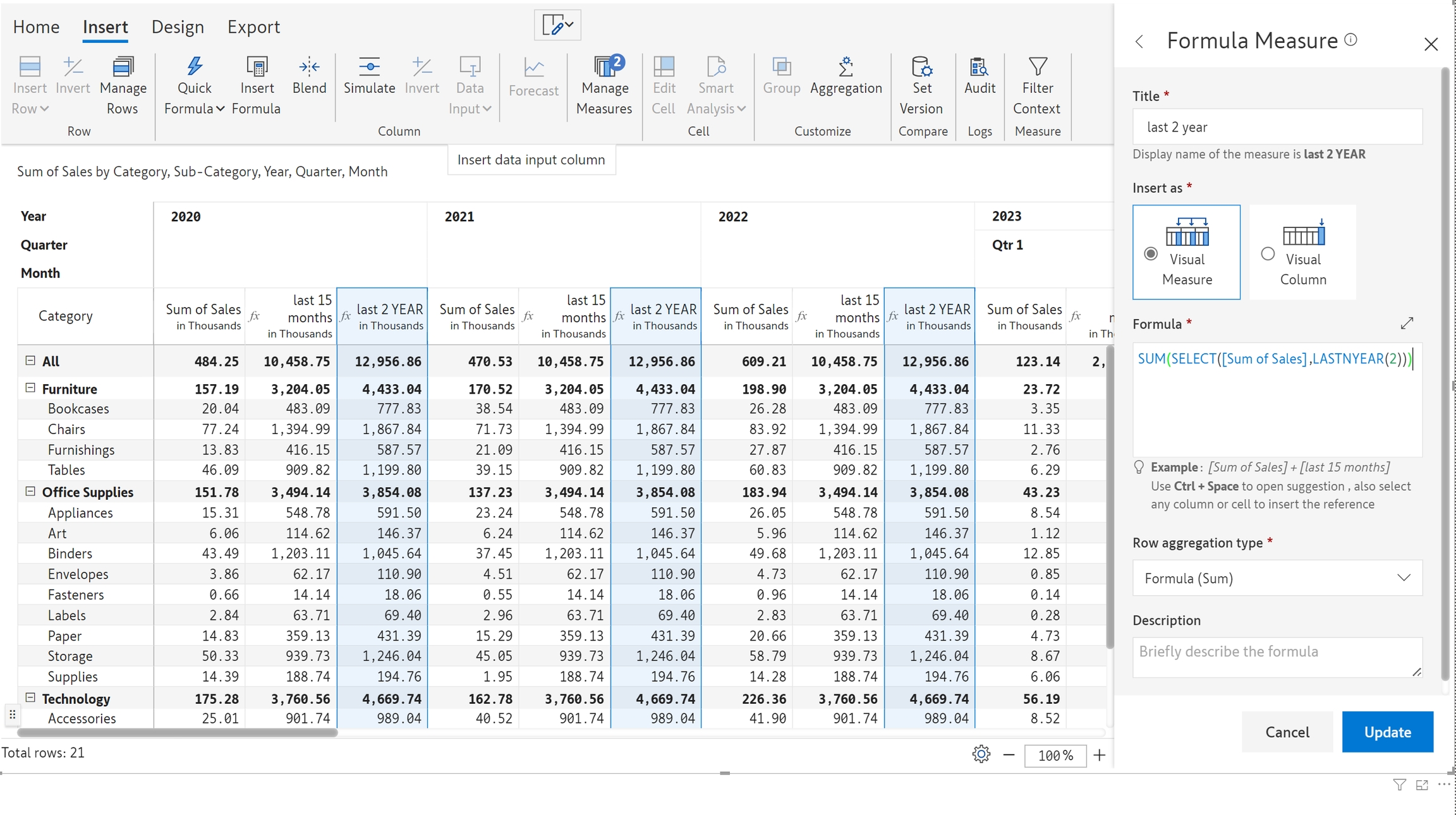 The LASTNYEAR function can be used to select data from a given measure, for a specified number of years preceding the current year. It should be used in conjunction with the SELECT clause and with an aggregate function like SUM or AVERAGE.