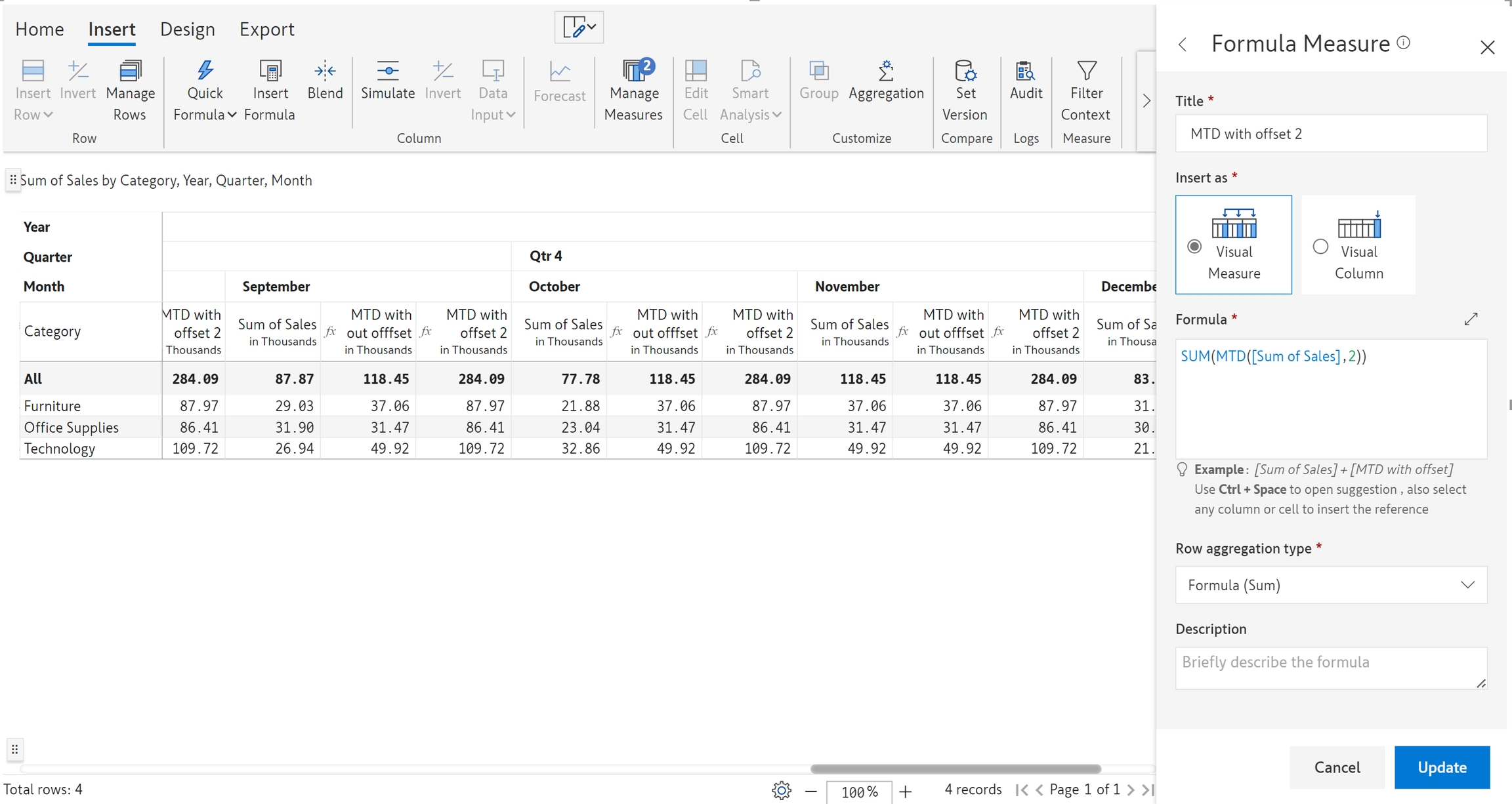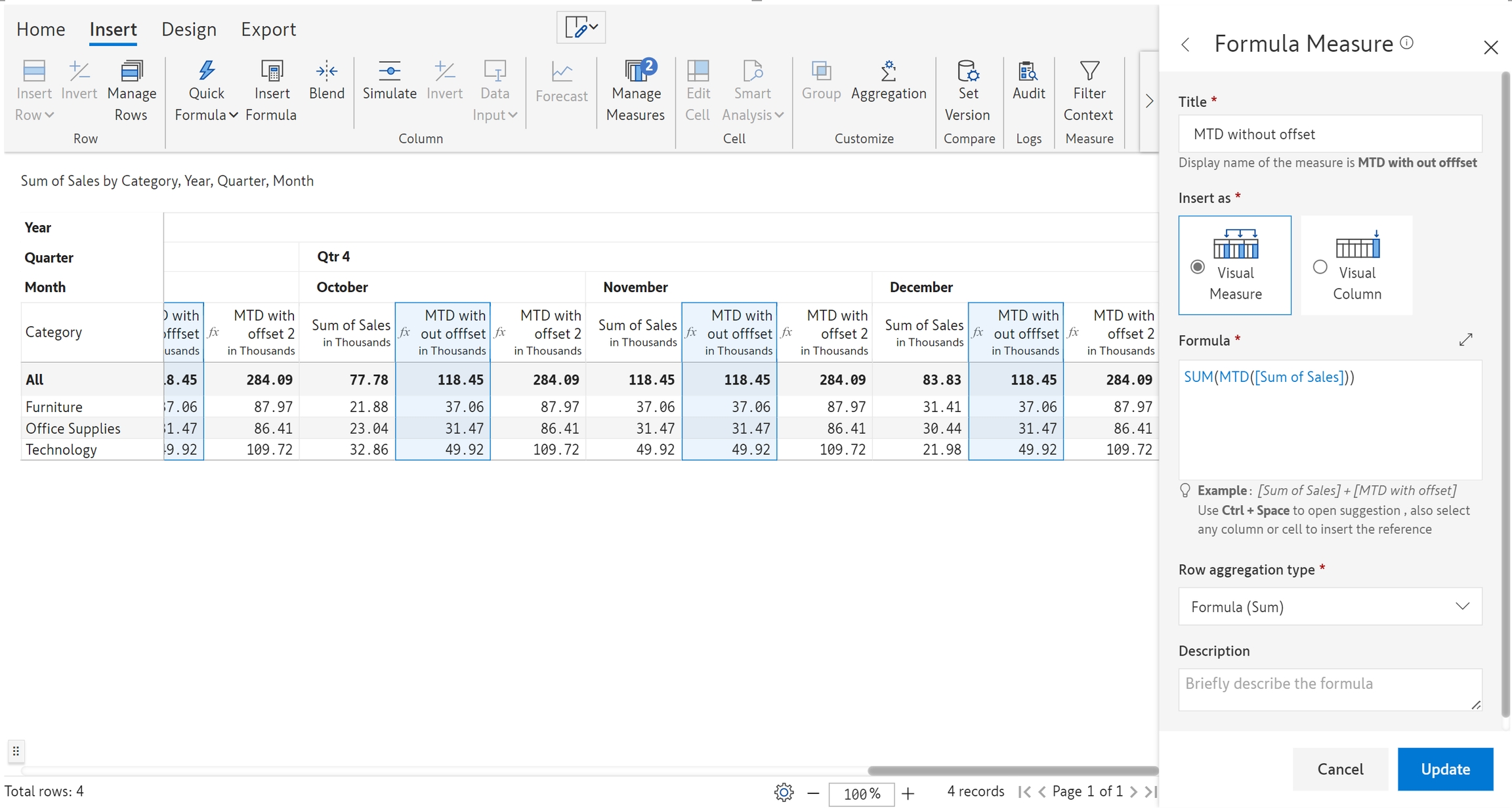 The MTD function can be used to select data from a given measure, for the current month. If an offset parameter is provided, previous months will also be returned. It should be used in conjunction with an aggregate function like SUM or AVERAGE.